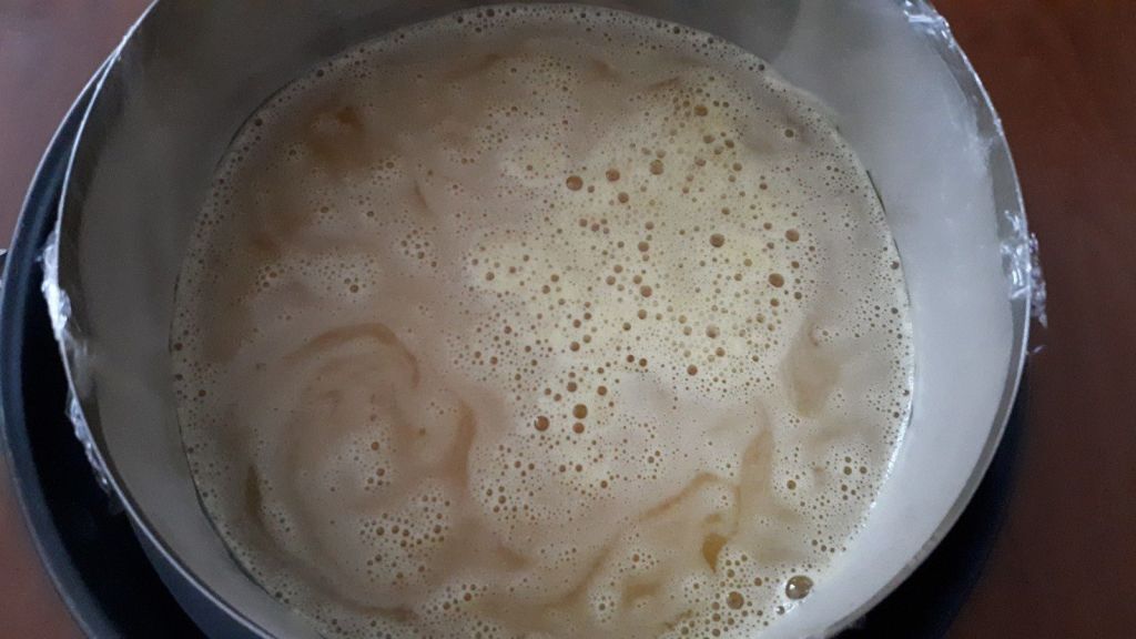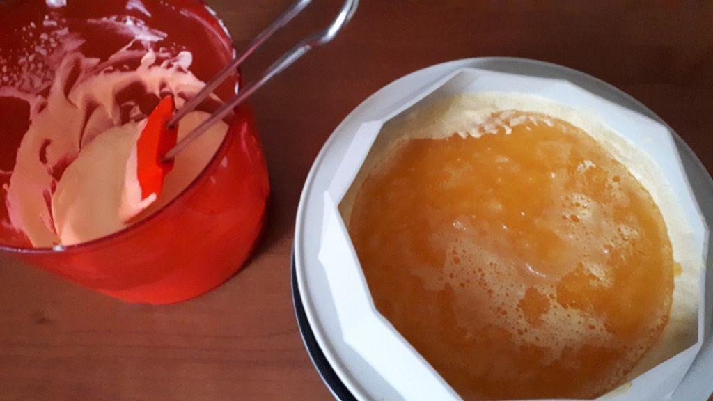 - Laisser refroidir, puis mettre dans le cercle préalablement filmé. Placer le tout au congélateur pour au moins 3h.