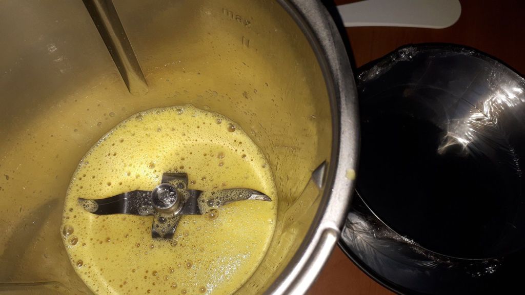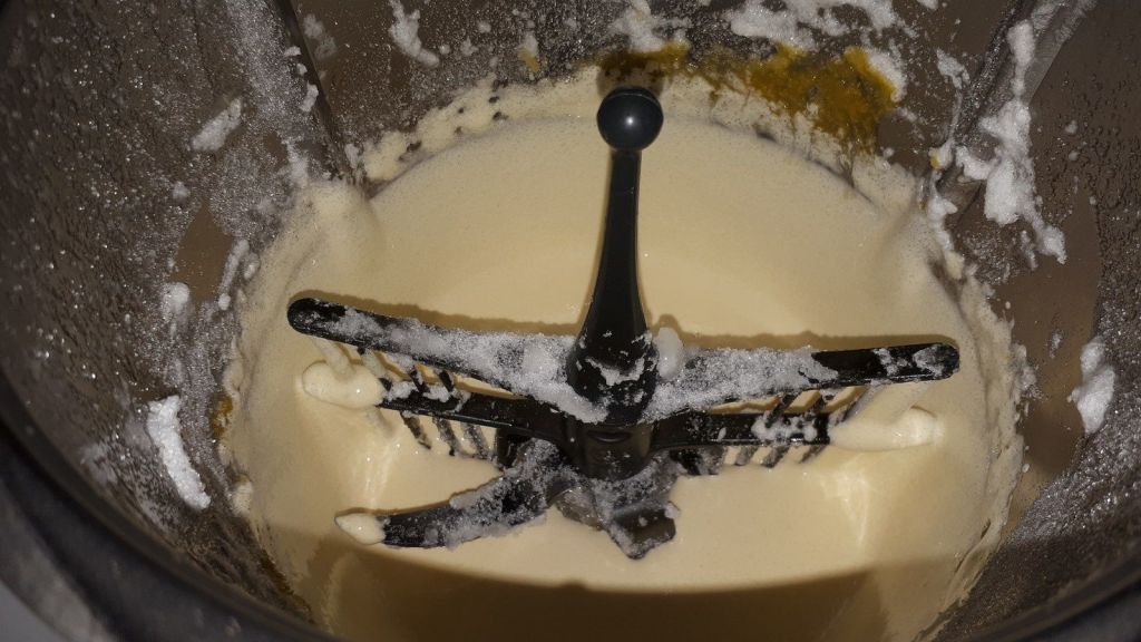 - Inutile de rincer le bol, mettre le jaune avec la sucre et le fouet puis mélanger 2min/vit3, enlever le fouet, puis verser la farine par le trou du couvercle pendant 1min/vit3, ajouter le blanc et continuer le mélange 1min/vit3.