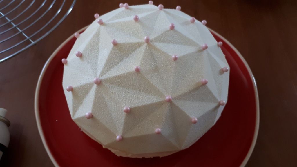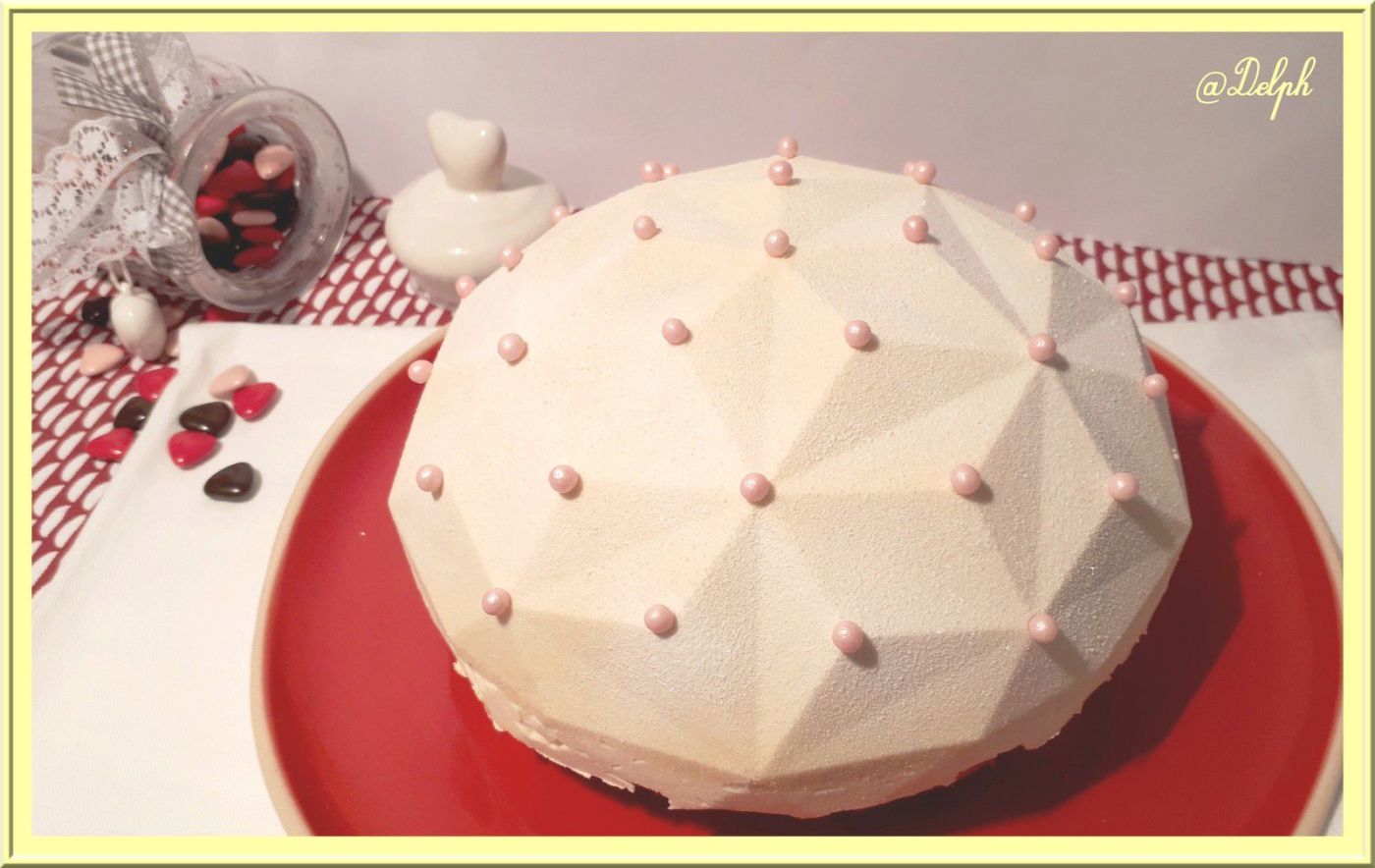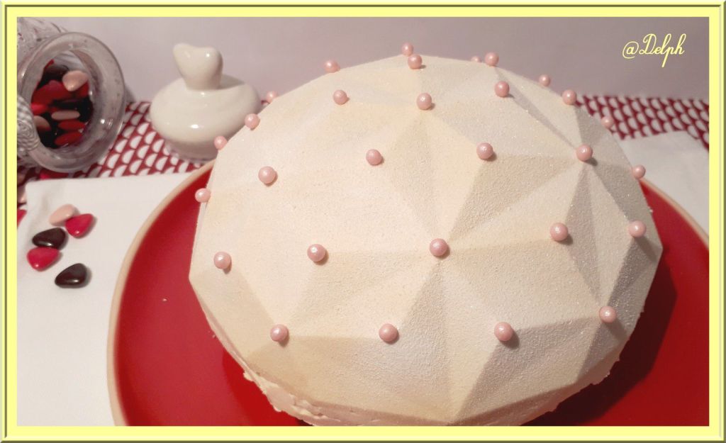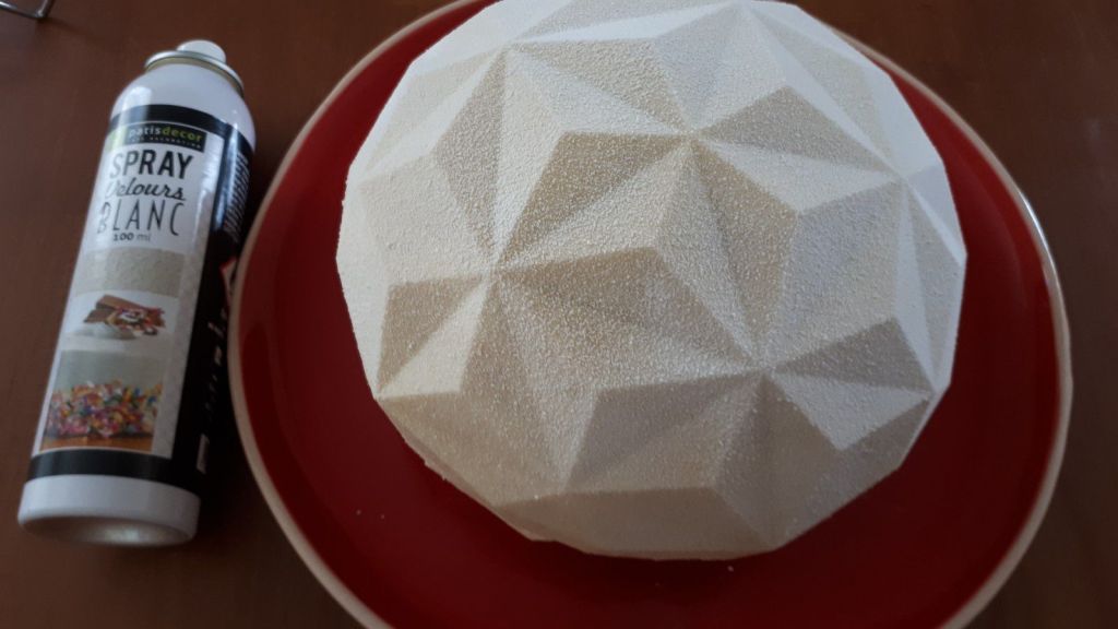 - Sortir l’entremets glacé du congélateur, le poser sur une volette à gâteau, et passer le spray (l’entremets doit être congelé) et décorer selon vos goûts.
