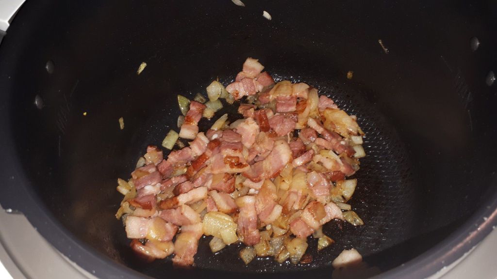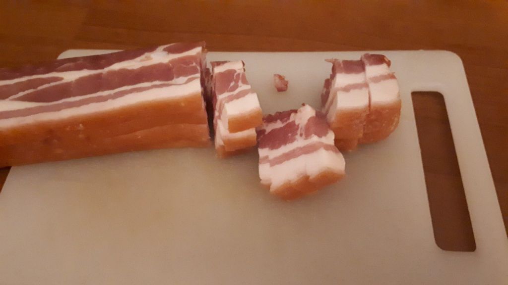 - Couper la poitrine en lanières, peler et ciseler l’oignon. Les faire revenir dans une poêle anti adhésive, à feu doux, jusqu’à ce qu’ils soient dorés.