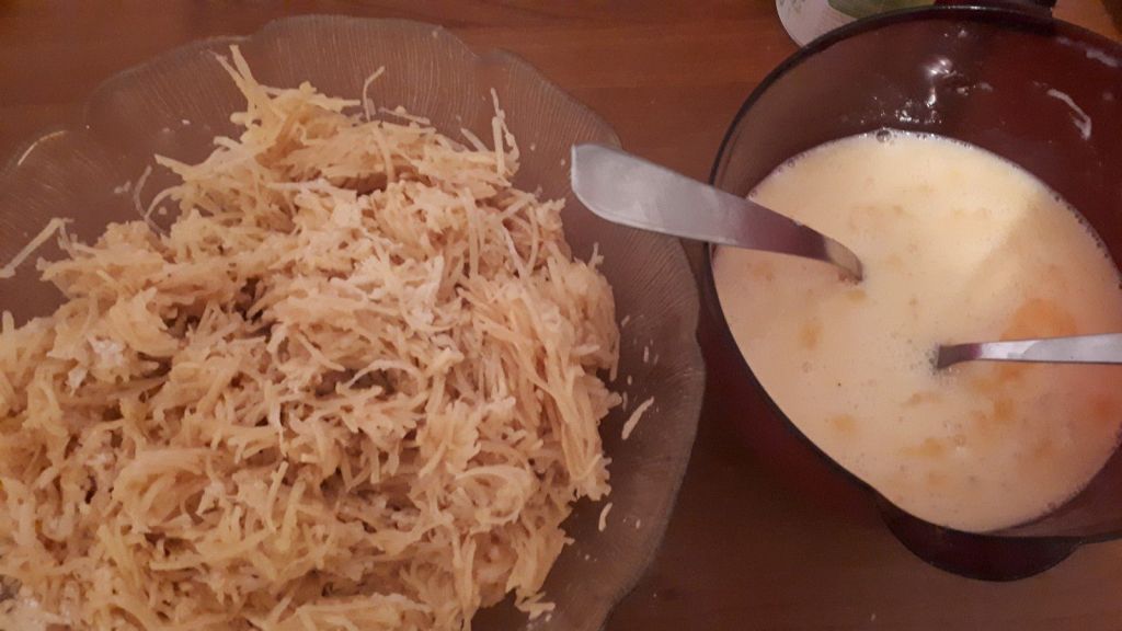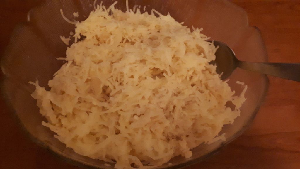 - Peler et râper les pommes de terre dans un grand plat sans les égoutter.