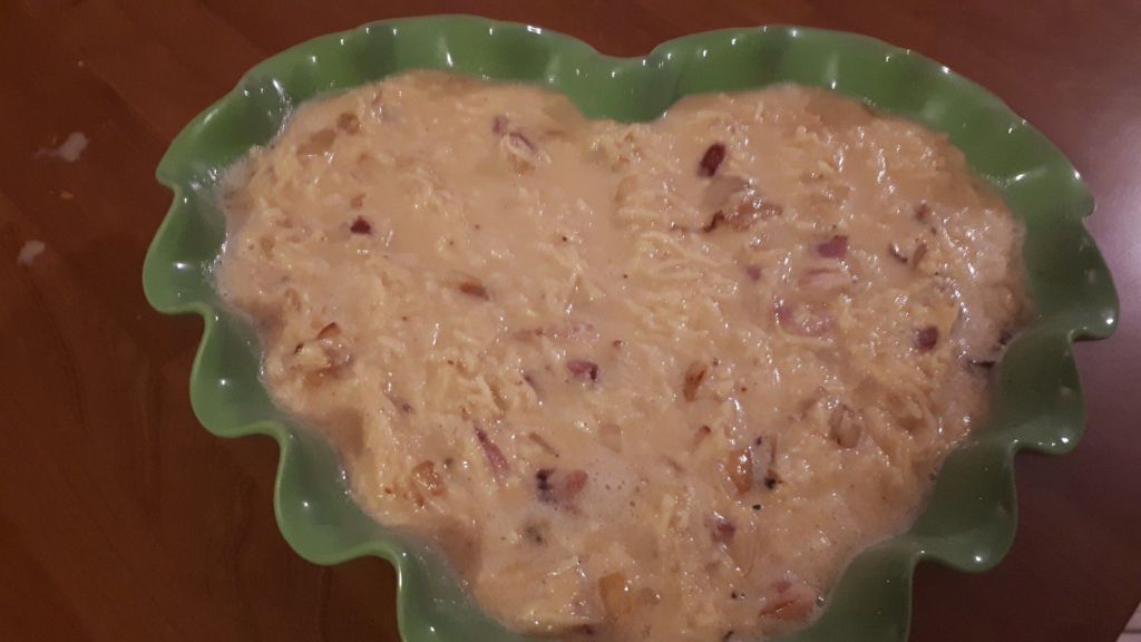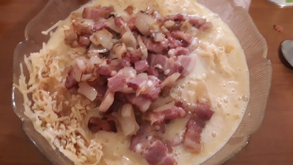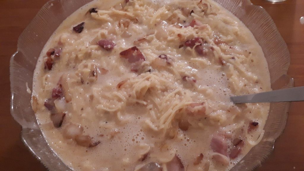 - Dans un saladier mélanger le beurre fondu avec le lait concentré, les œufs, saler et poivrer, mélanger cette préparation aux pommes de terre puis ajouter les lardons et les oignons.