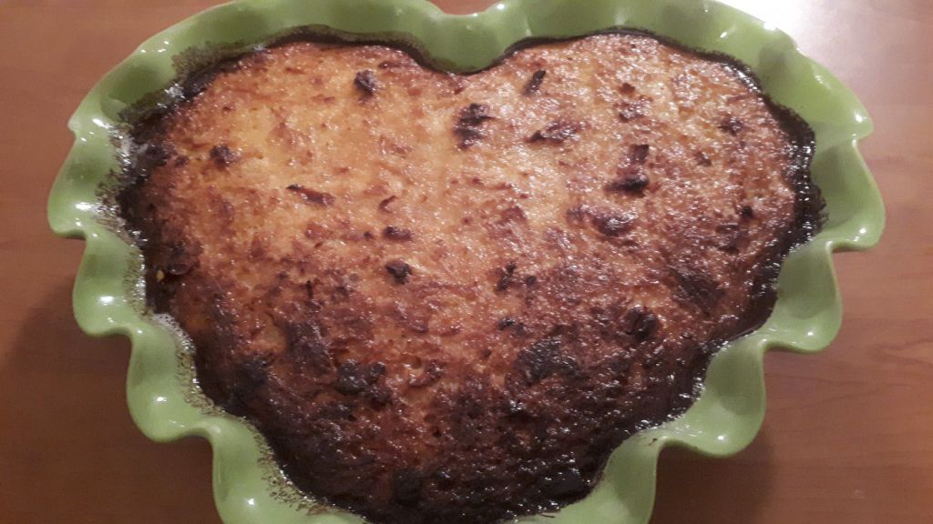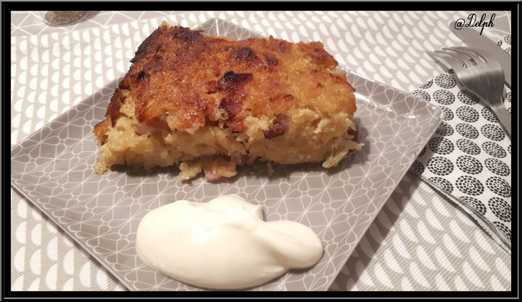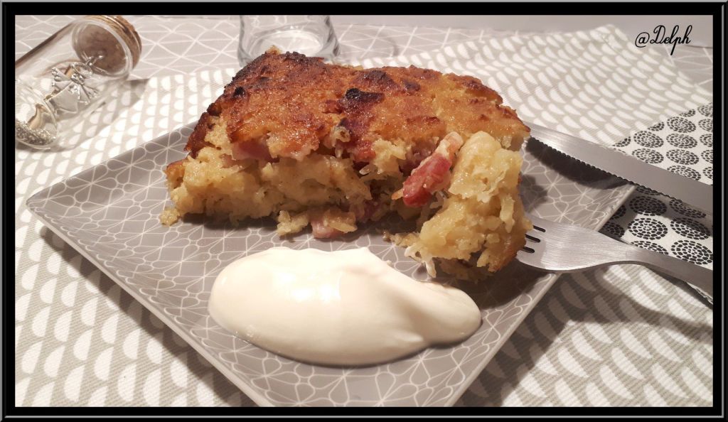 Le kugelis est un plat de pommes de terre qui peut se consommer avec de la compote de pommes , de la confiture d’airelle ou de la crème fraîche, nous avons opté pour cette dernière.
