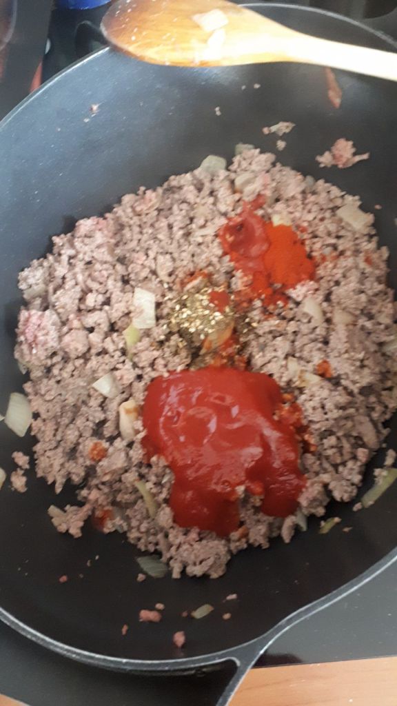 - Une fois la viande dorée, ajouter les épices, le sel, le poivre et la pâte de tomates. Remuer et laisser chauffer environ une minute.