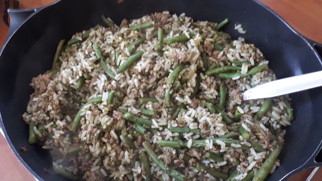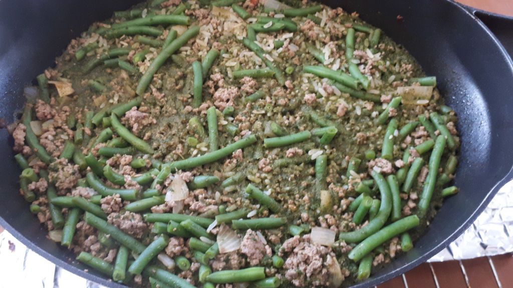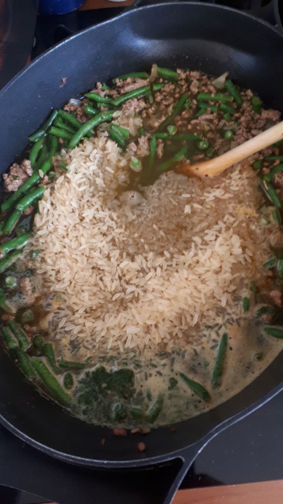- Ajouter ensuite l’eau et bien mélanger. Laisser bouillir la sauce et ajouter les légumes, les haricots verts et les épinards. Laisser cuire les légumes environ 5 minutes, puis éteindre le feu. Ajouter le riz dans la casserole et remuer doucement.