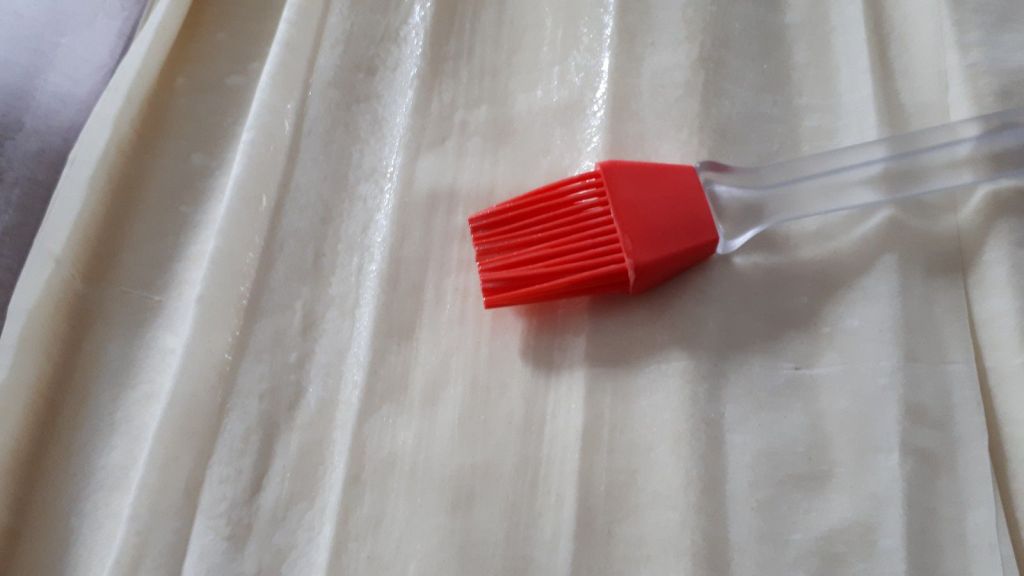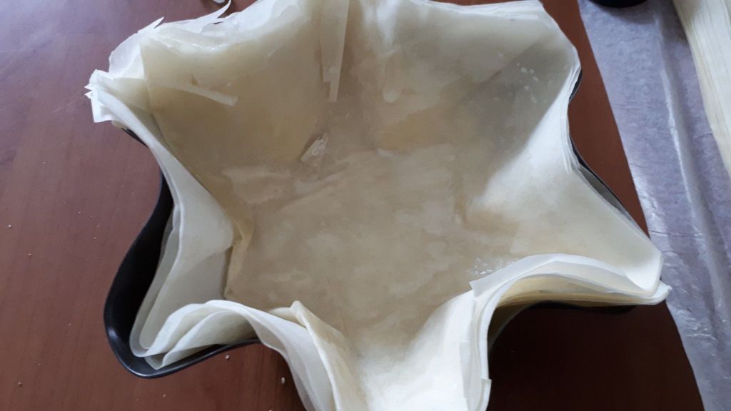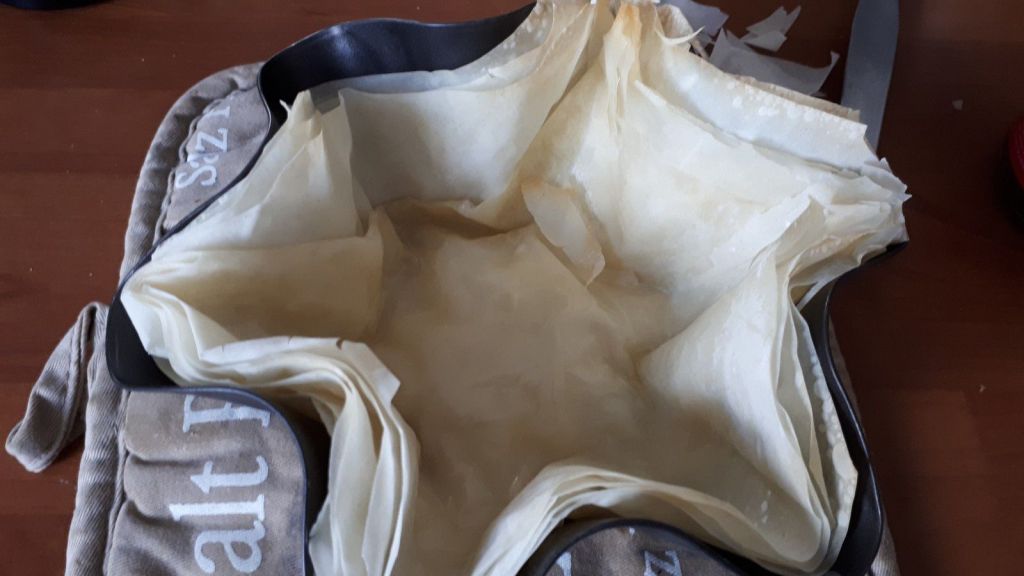 - Plier les feuilles de pâte filo en deux, puis à nouveau en deux. A l’aide d’un pinceau, les enduire légèrement de beurre fondu, les disposer dans votre moule collerette en les superposant. Couper les bords pour que cela soit régulier.