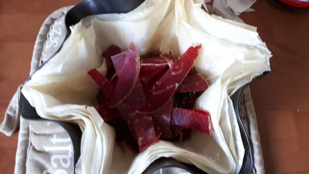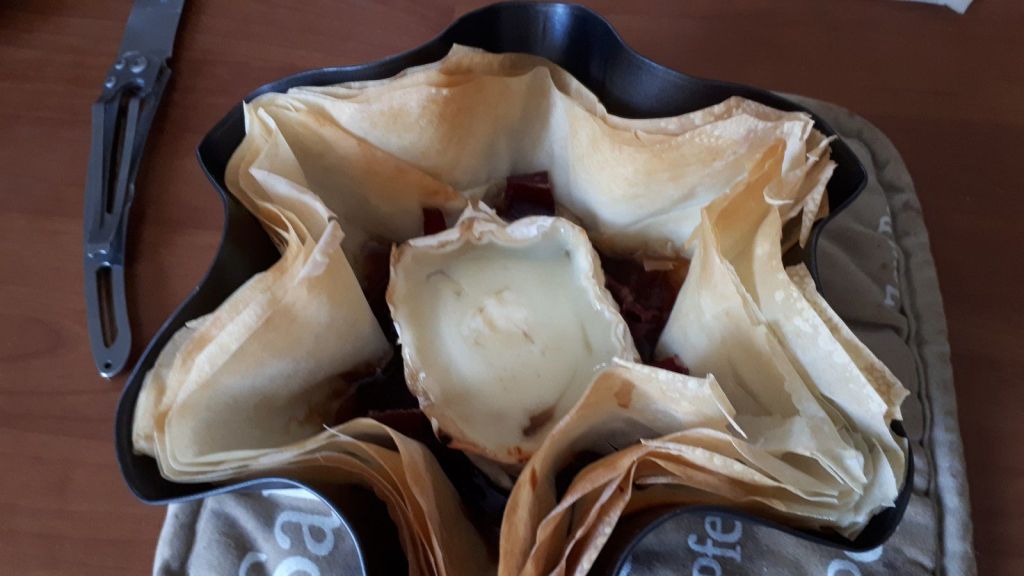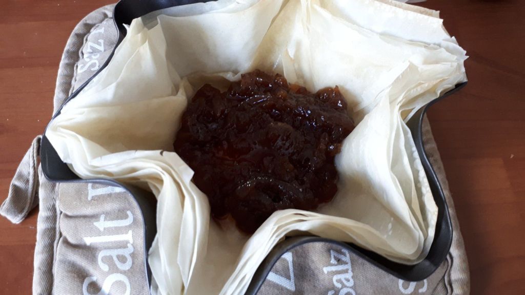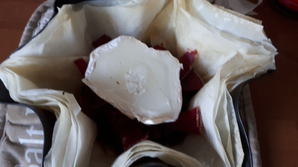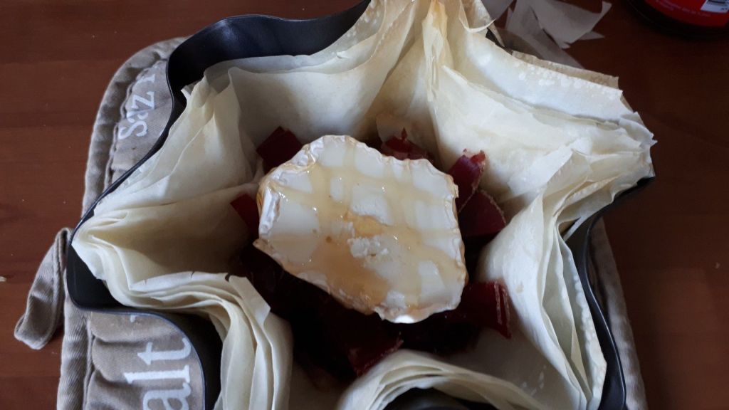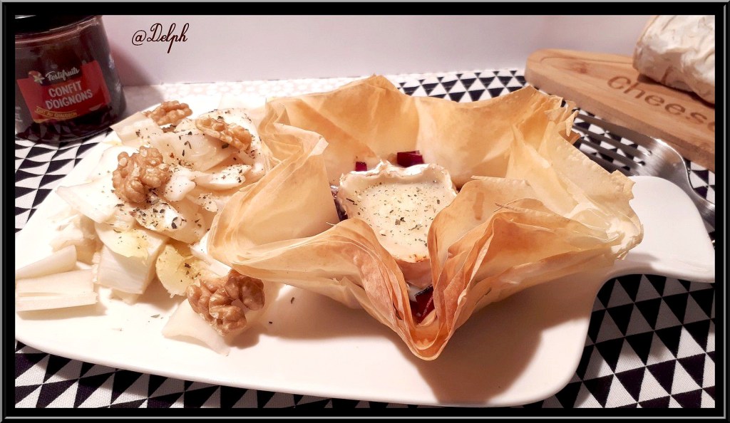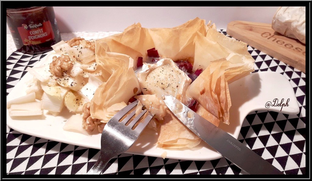 Avec le confit d’oignons que j’ai reçu dans la box hiver de Festifruits, je me suis réalisée un petit repas gourmand…Une petite assiette pour les midis où je mange seule. Avec la pâte filo, le feuilleté est croquant et un peu moins calorique qu’avec une pâte feuilletée traditionnelle, je me suis inspirée d’une recette trouvée chez Luna.