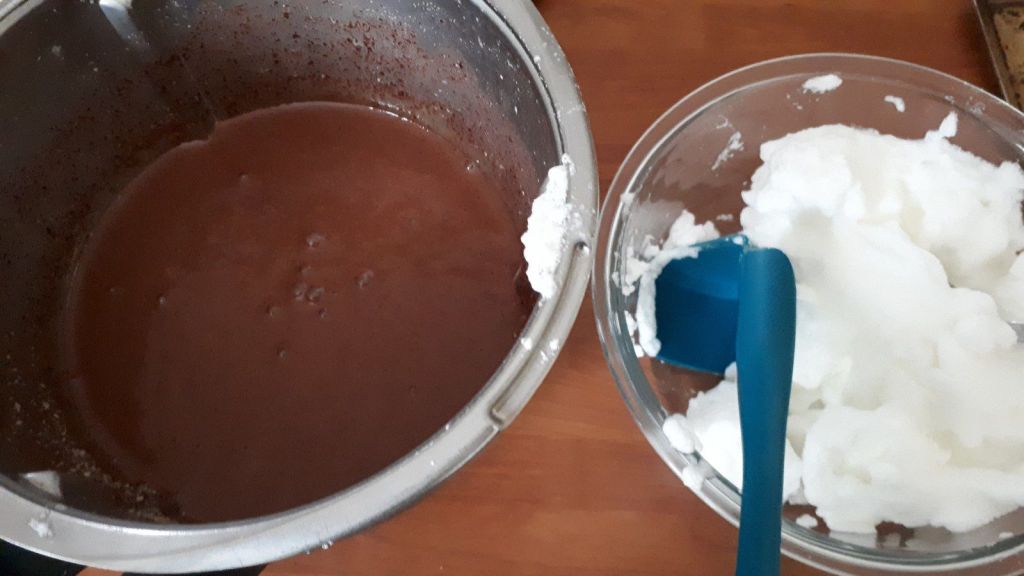 - Intégrer délicatement les blancs en neige avec la spatule. La pâte est assez liquide, c’est normal.