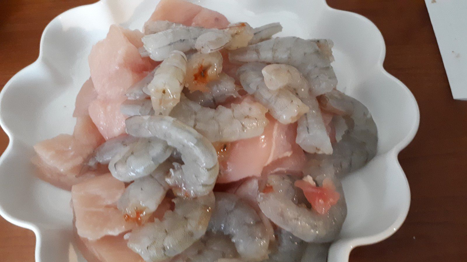 - Verser l’huile dans un wok chaud, ajouter la pâte de piment; le poulet et les crevettes, faire colorer à feu vif.