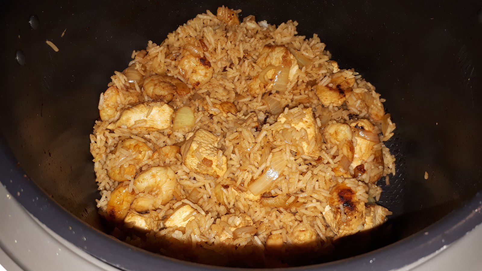- Ajouter le riz cuit, mélanger, ajouter les sauces, mélanger à nouveau et laisser chauffer encore 2 minutes, assaisonner à votre goût. Éteindre et laisser dans la cuve le temps de faire frire vos oeufs.
