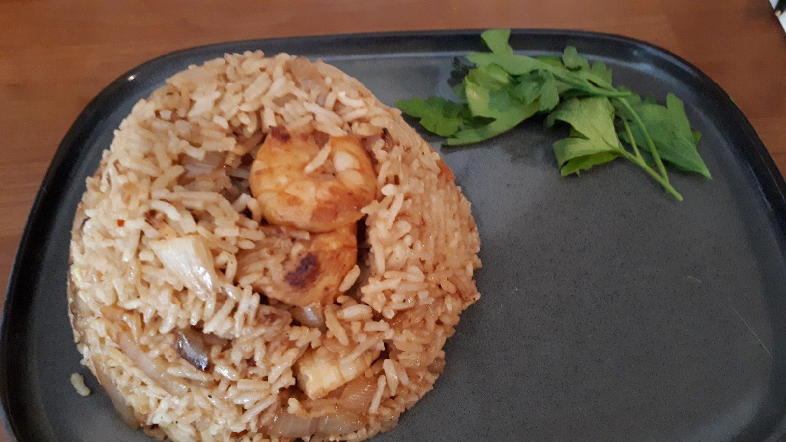 - Ajouter les oignons et les gousses d’ail, laisser revenir environ 5 minutes, ajouter le riz cuit, mélanger et laisser chauffer encore 5 minutes pour que le riz soit bien chaud; assaisonner à votre goût.