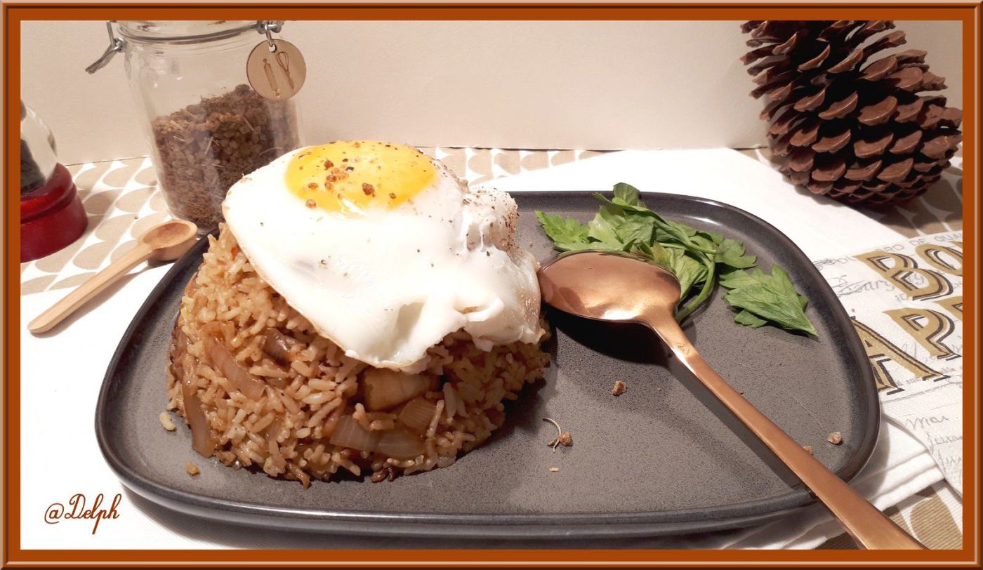 - Présenter le riz en dôme sur les assiettes, couvrir d’un œuf au plat.