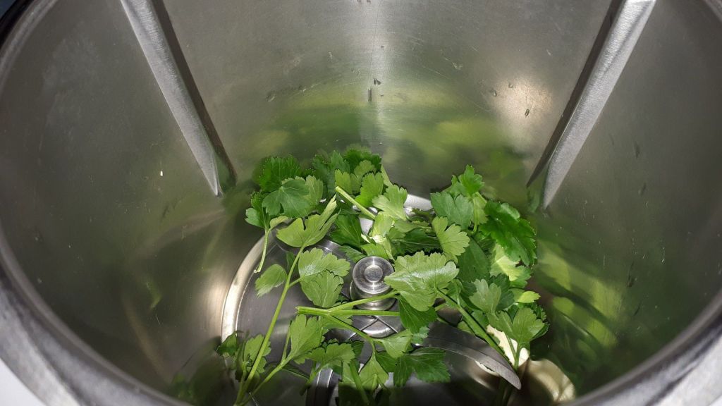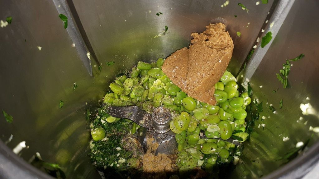 - Mettre dans le bol du Thermomix la gousse d’ail épluchée, dégermée et le persil sans les tiges puis mixer 5sec/Vit 6, racler les bords, ajouter les fèves cuites, la pâte de sésame, le cumin, le sel, le poivre, 1 c à s d’eau de cuisson des fèves puis mixer 10sec/vit6.