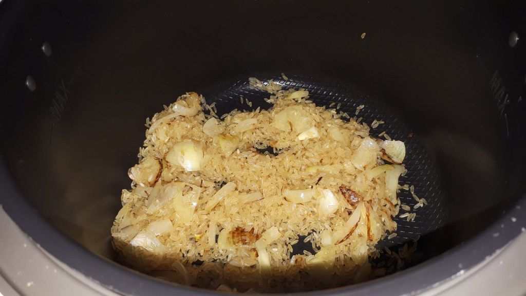 - Éplucher et ciseler votre oignon, le faire revenir dans une cuillère à soupe d’huile, ajouter le riz; mélanger et laisser sur feu doux environ 2 minutes en remuant.