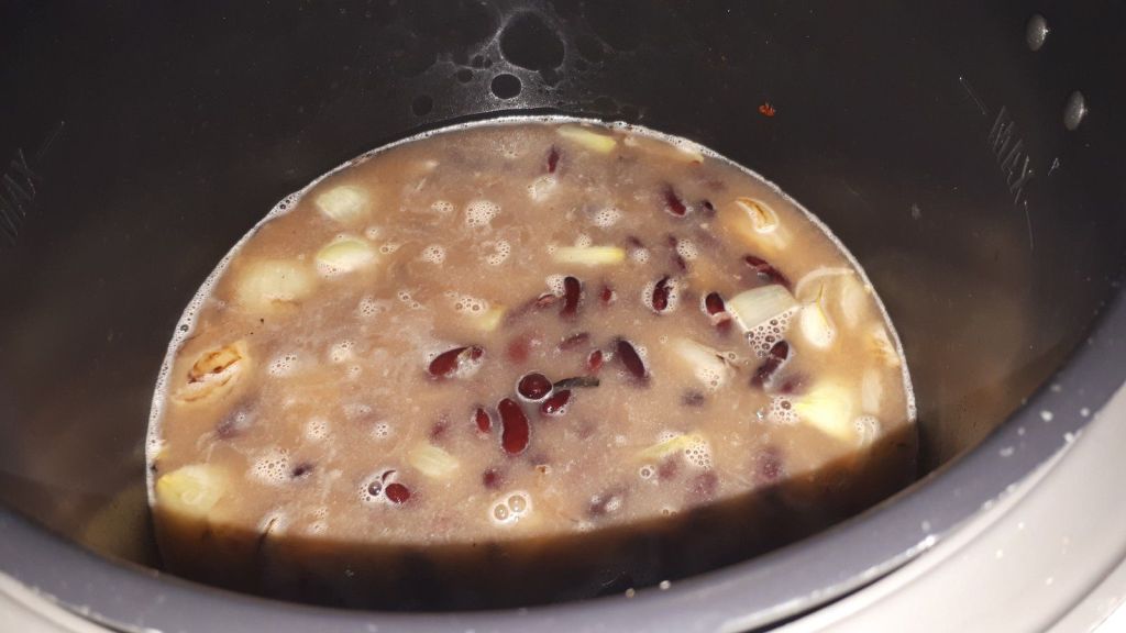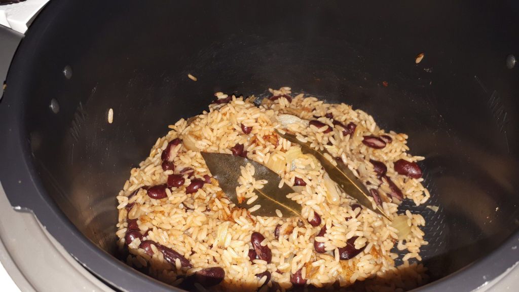 - Éplucher et ciseler votre oignon, mettre le cookéo en mode dorer et dès le préchauffage mettre l’huile et l’oignon, mélanger. En fin de préchauffage ajouter le riz, mélanger et laisser dorer 2 minutes, ajouter les haricots, le concentré de tomate, l’assaisonnement, (sel, poivre, laurier) l’eau.