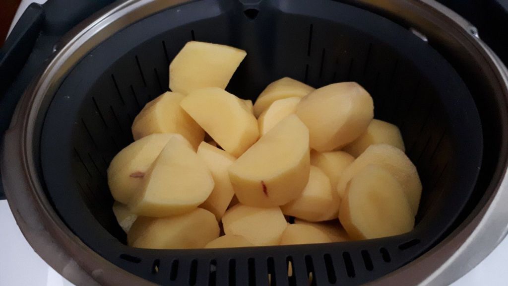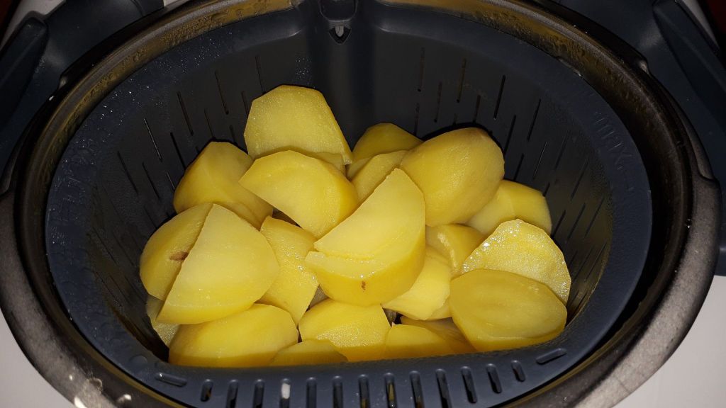- Laver puis éplucher les pomme de terres. Les mettre dans le panier cuisson. Verser 500g d’eau dans le bol du Thermomix, insérer le panier cuisson et faire chauffer 20min/varoma/Vit1.