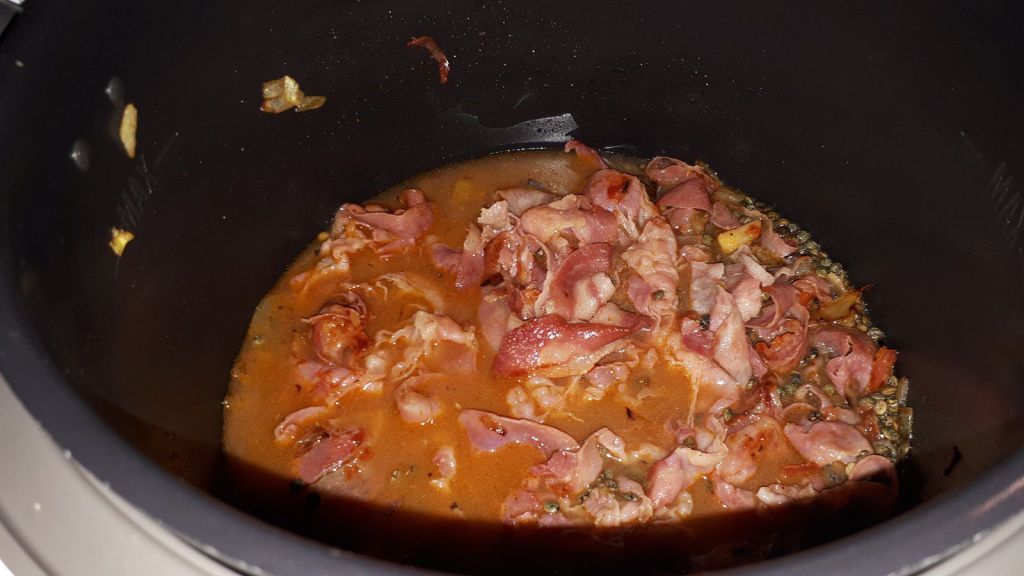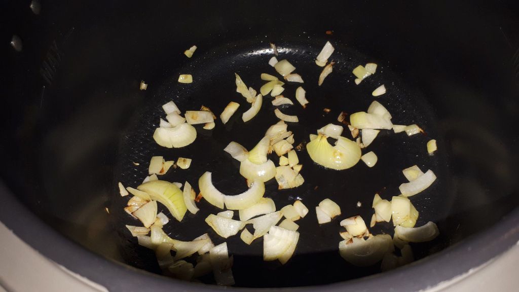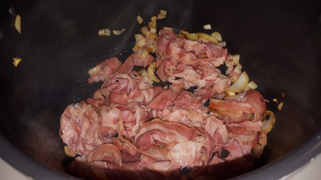 - Mettre le Cookéo en mode dorer, éplucher et ciseler votre oignon, le faire dorer dans l’huile d’olive environ 1 minute, mélanger ajouter la pancetta et laisser dorer 3 minutes en remuant régulièrement.