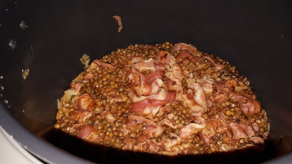 - Ajouter les lentilles vertes, le bouillon, le concentré de tomates un peu de poivre et passer en mode sous pression pour 20 minutes.