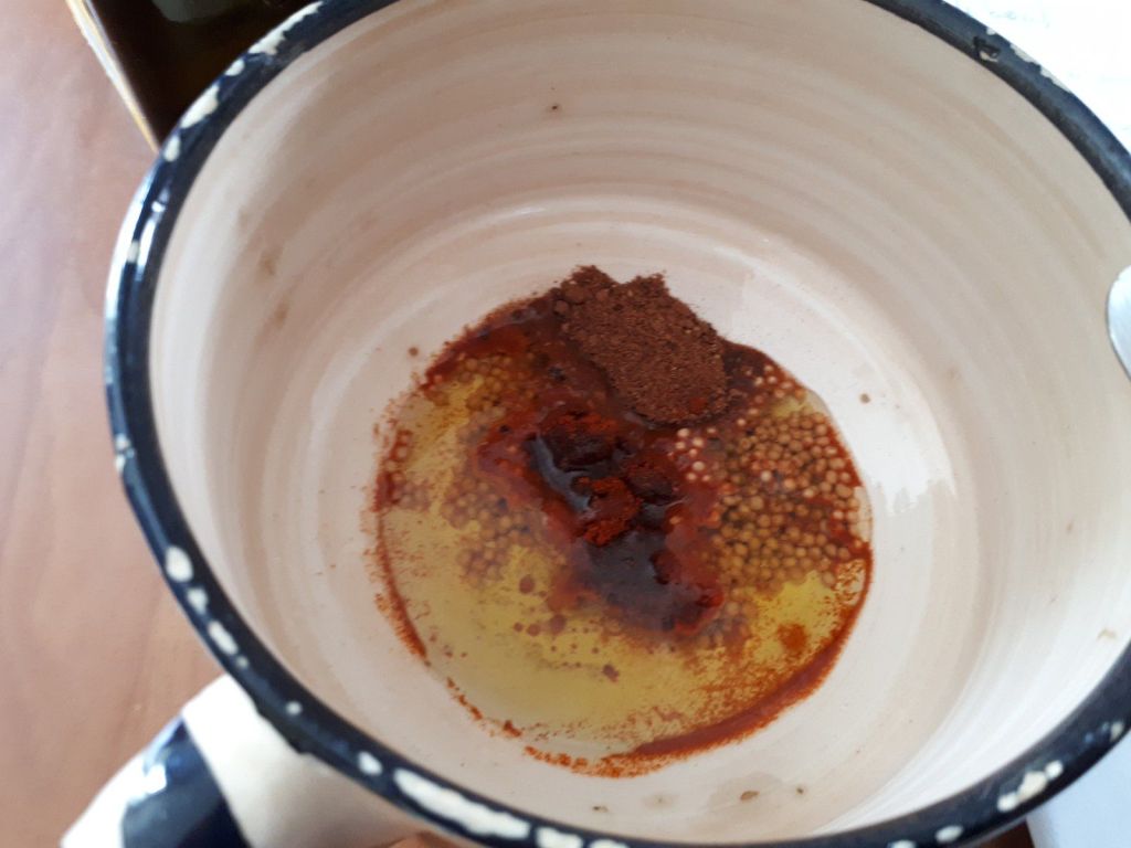 - 1 c à s d’épices ( mélange de sel de céleri, chili, paprika, ail, oignon, fleur de maïs, je n’ai pas trouvé de fleur de maïs)