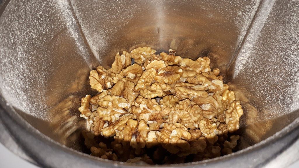 - A l’aide d’un mixeur, réduire les biscottes en chapelure et les cerneaux de noix en poudre, mélanger et réserver.
