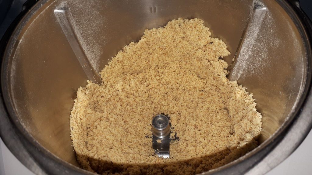 - Mettre les biscottes dans le bol et mixer 6sec/Vit7, ajouter les noix, mixer 4sec/vit7. Réserver dans un récipient. Inutile de rincer le bol.