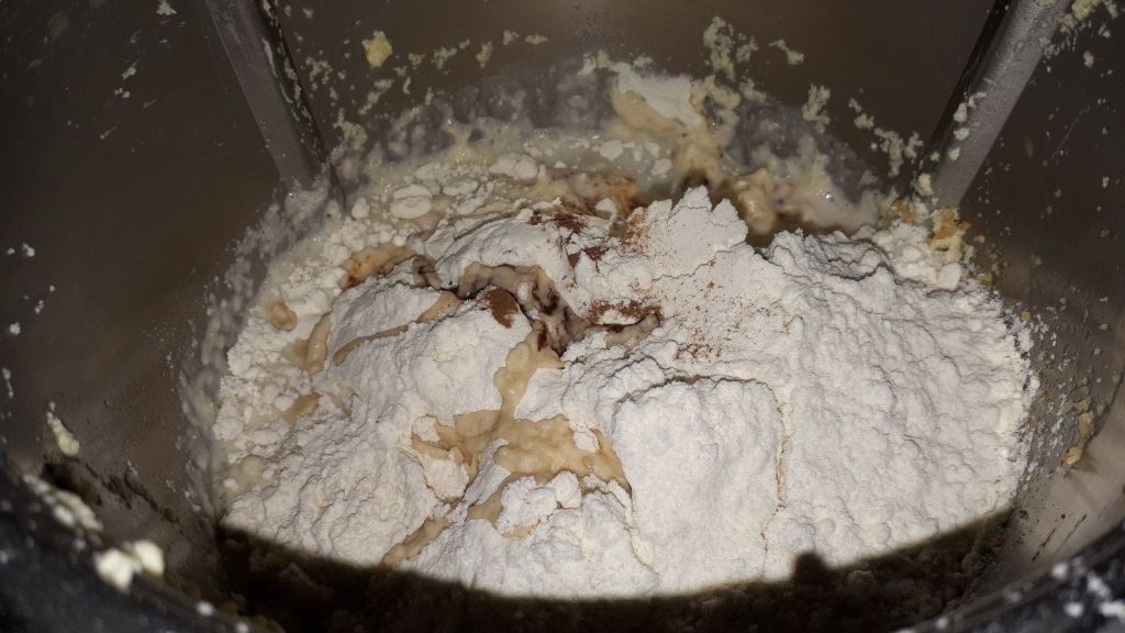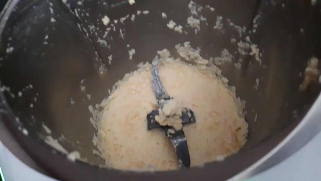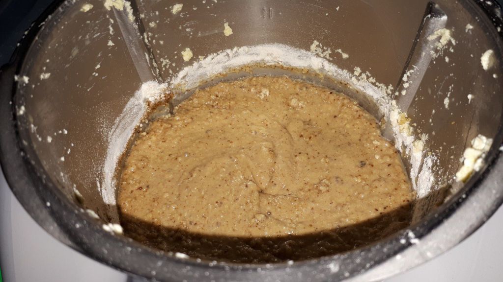 - Mettre le beurre et les œufs dans le bol et mélanger 2min/vit4, ajouter le mélange biscottes-noix, le sucre muscovado, la farine, la cannelle, la levure, le brandy et le lait mixer 25sec/vit4.
