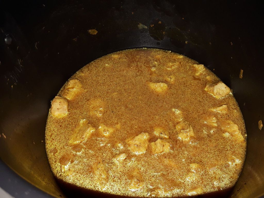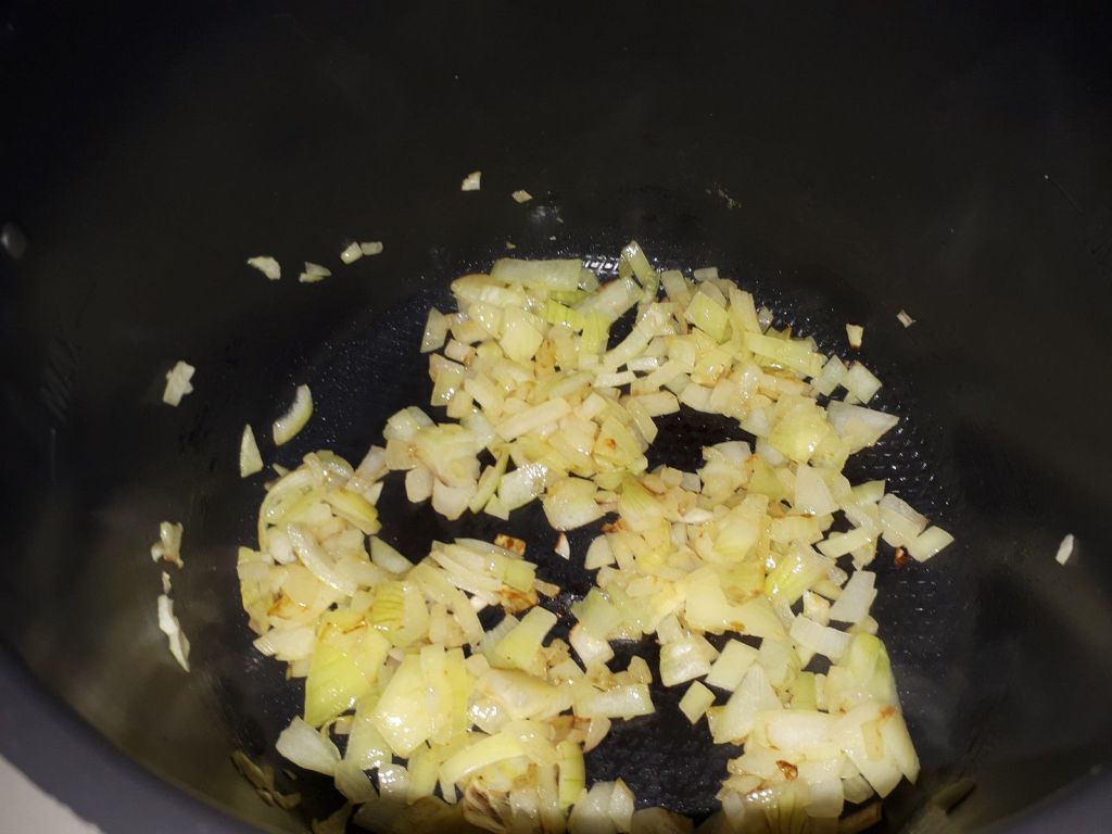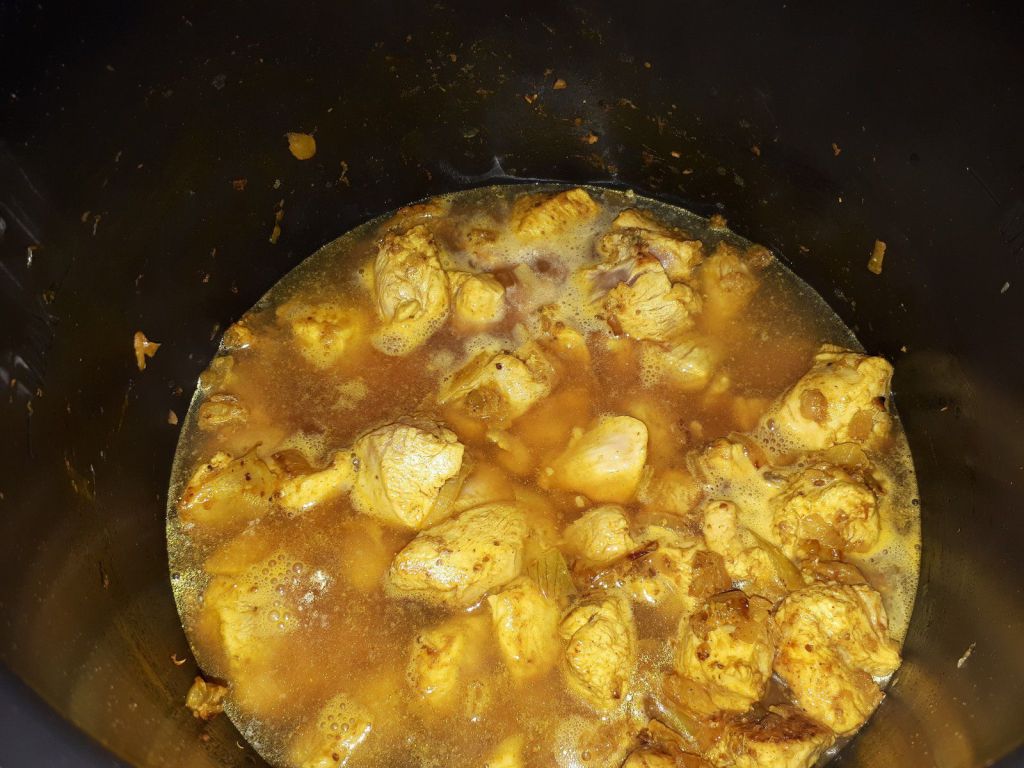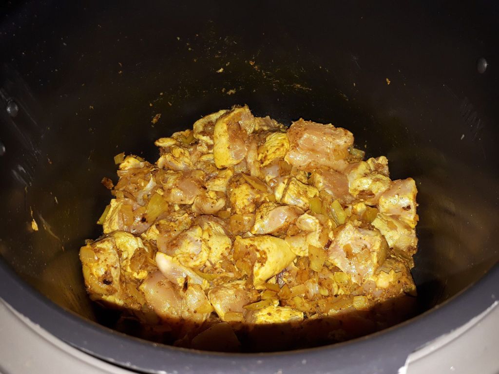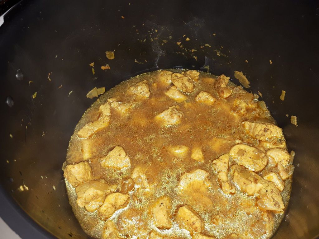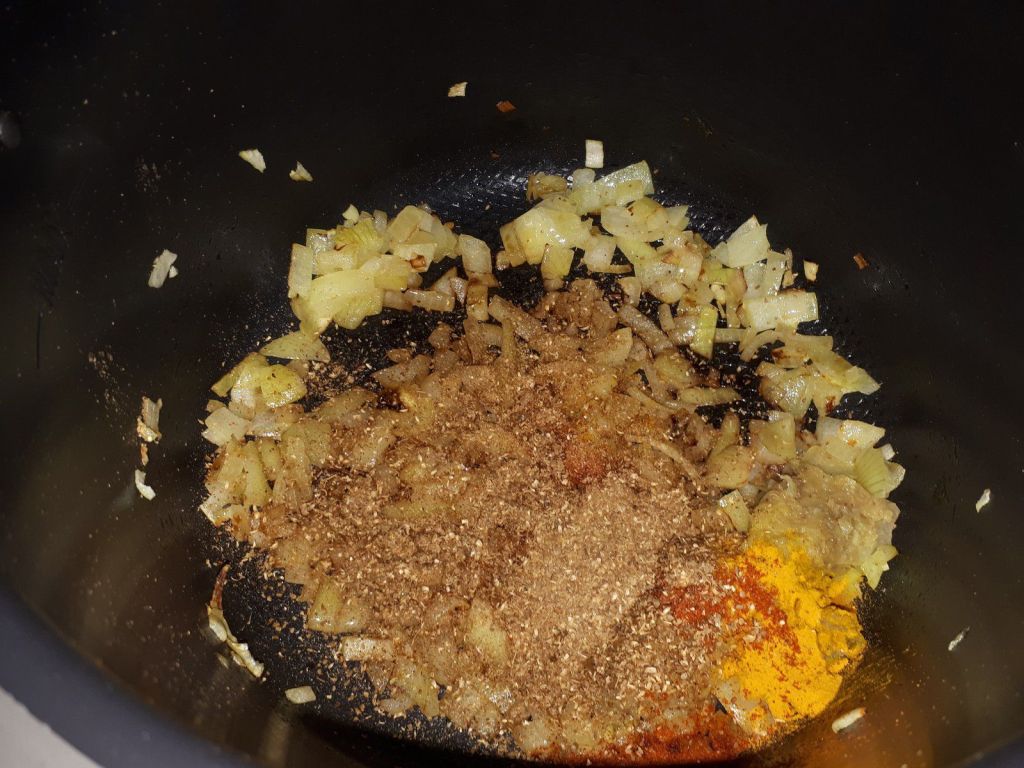 - Mettre votre cookéo en mode dorer, ciseler votre oignon et le faire dorer dans l’huile d’olive pendant 2 minutes ajouter, une giclée d’eau, 3 cuillères à café de purée de gingembre, oignon, ail, le curcuma, le curry et le piment, mélanger et continuer à dorer 2 minutes.