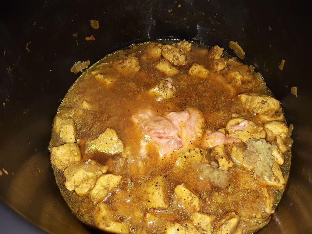 - Ajouter une giclée d’eau, bien mélanger et laisser frire pendant 2 minutes. Ajouter le poulet coupé en dés de 2 cm. Laisser revenir.