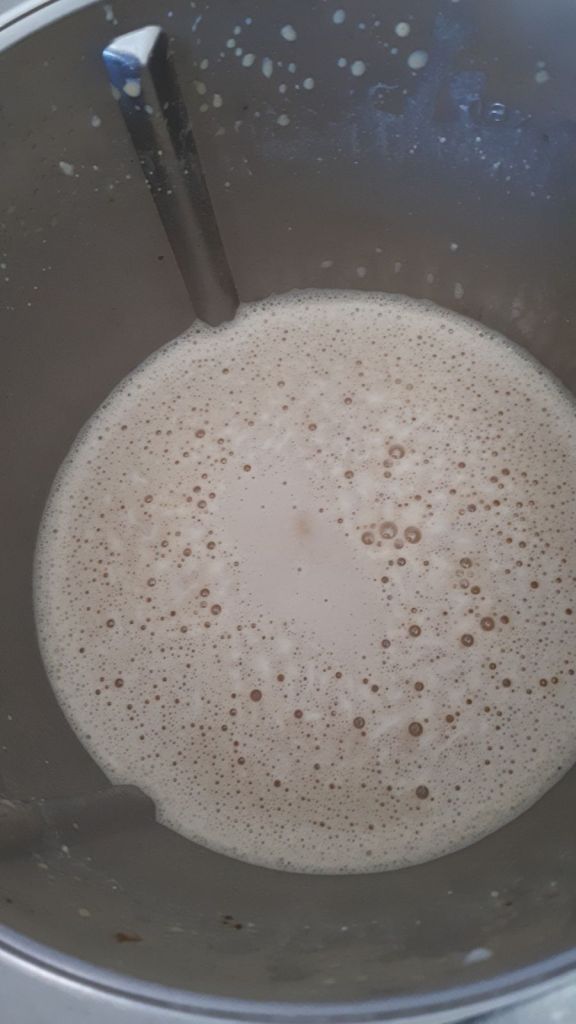 - Dans le bol, mettre le lait d’amande, les œufs, le sucre, la farine et le rhum, mixer 1 min/vit 4.
