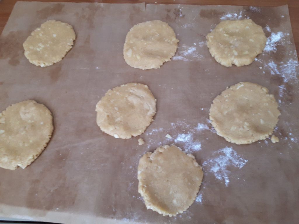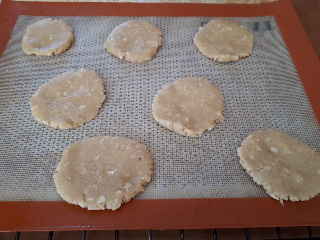 - Déposer sur une plaque couverte de papier cuisson puis, à l’aide de votre paume, aplatir légèrement le dessus.