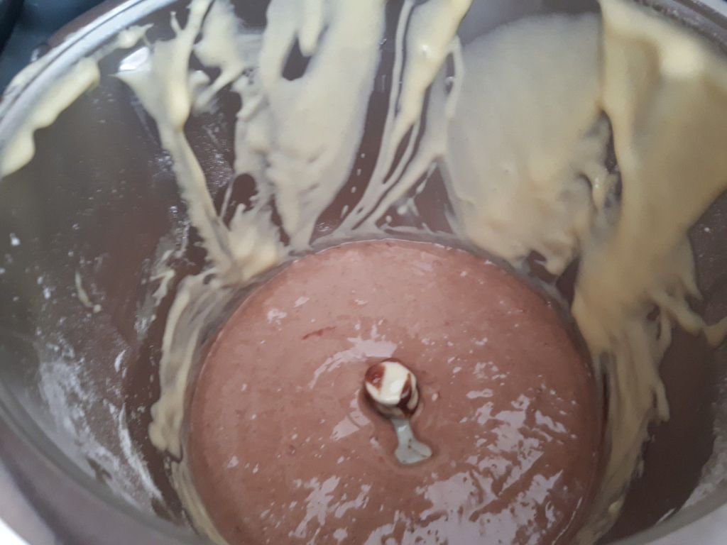 - Peser la pâte et laisser un peu plus de la moitié nature ( environ 50 g en plus) remettre l’autre partie de la pâte dans le Thermomix et ajouter 3 belles cuillères à soupe de pâte à tartiner et mélanger 20sec/vit3.