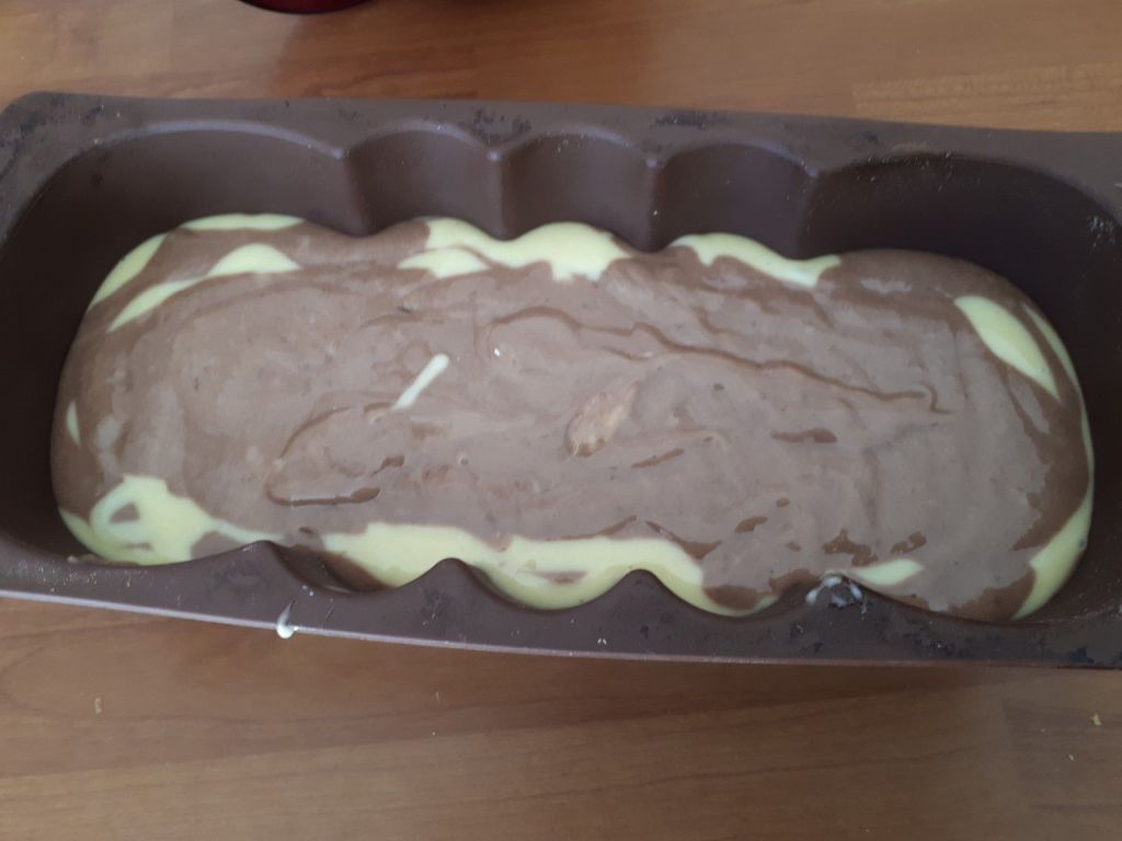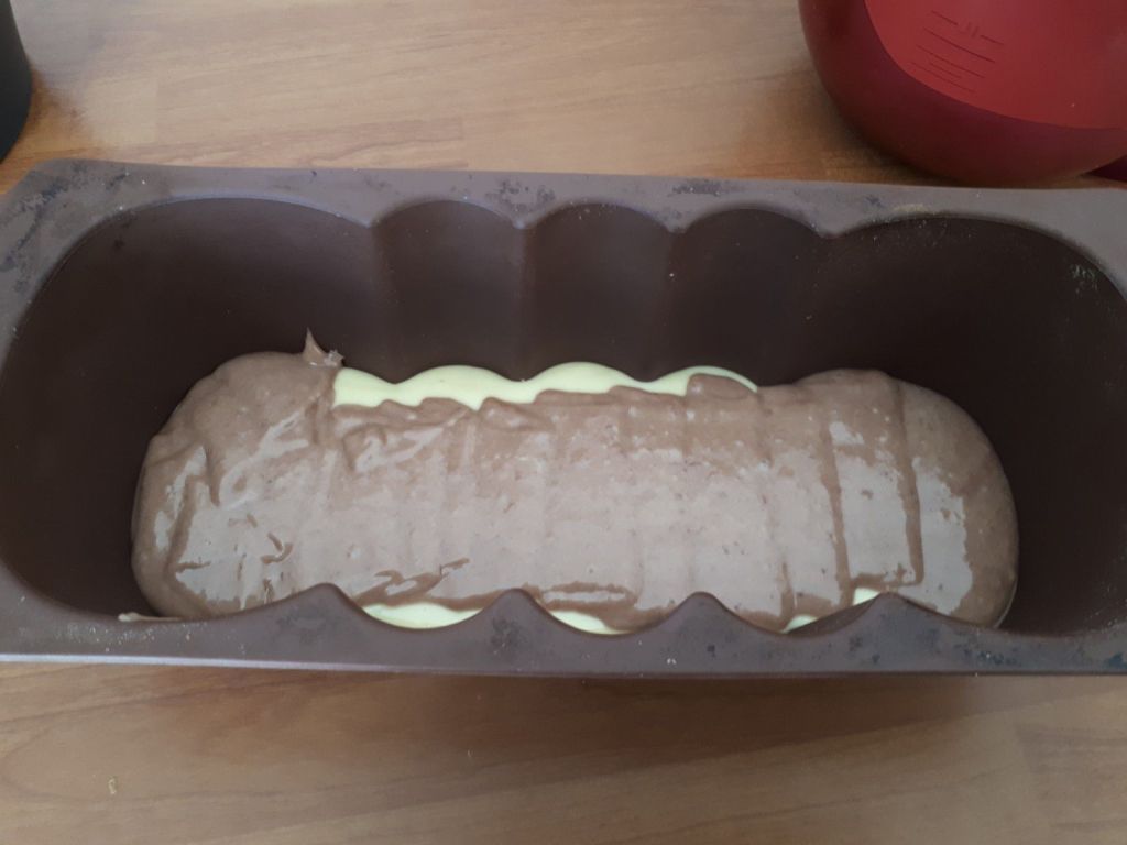 - Alterner les couches de pâte nature et au chocolat dans un moule en silicone .