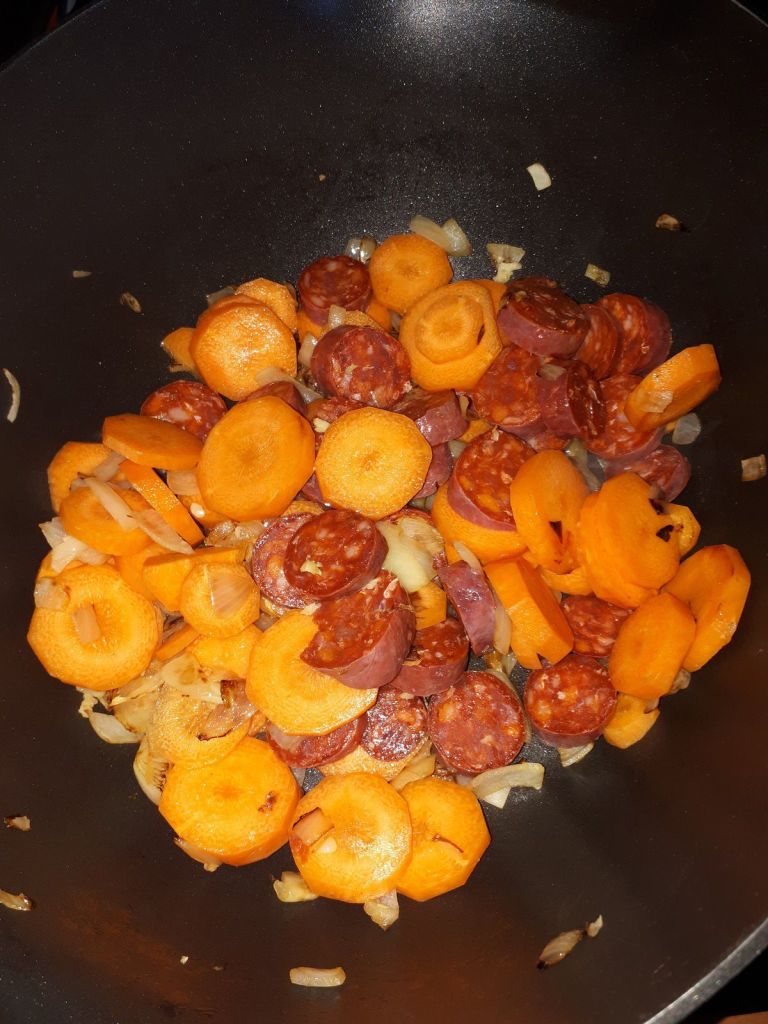 - Ajouter les carottes et le chorizo et laisser cuire pendant 2 minutes, mélanger.