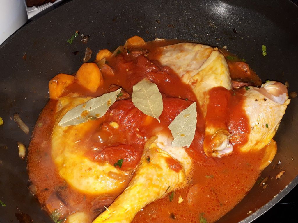 - Ajouter le vin blanc, les tomates concassées, la feuille de laurier et un peu d’eau.