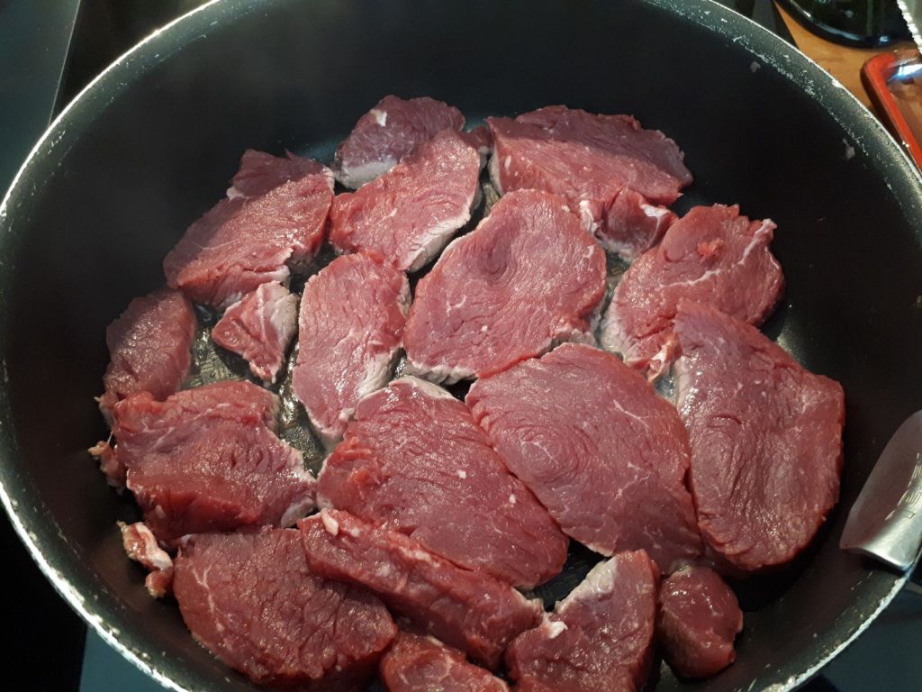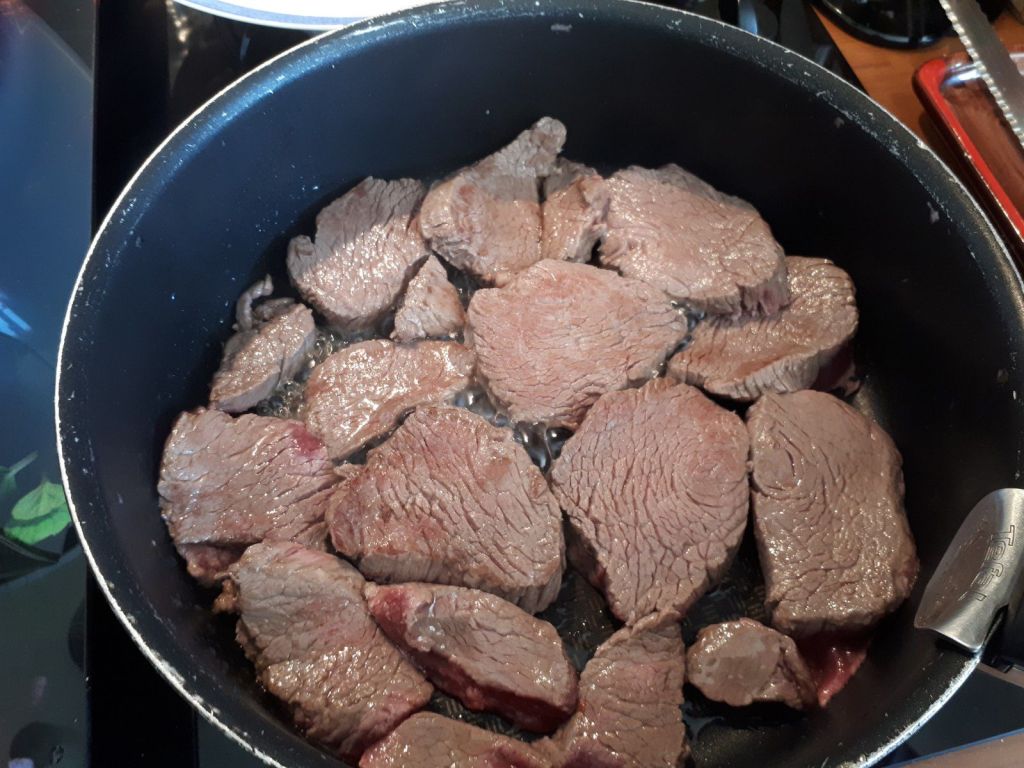 - Détailler votre bœuf en lanières, dans un wok mettre 2 c à s d’huile, lorsqu’elle est bien chaude déposer votre viande, la faire revenir 2 minutes de chaque côté. Réserver la viande.