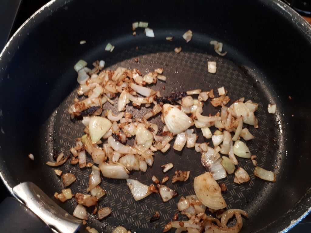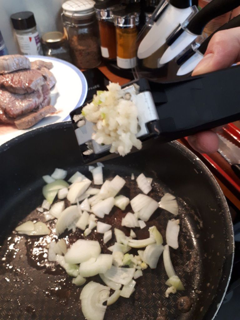 - Éplucher et ciseler votre oignon, hacher les deux gousses d’ail avec un presse ail, remettre une cuillère d’huile dans votre wok et faire revenir pendant 5 minutes, en mélangeant sur feu moyen.