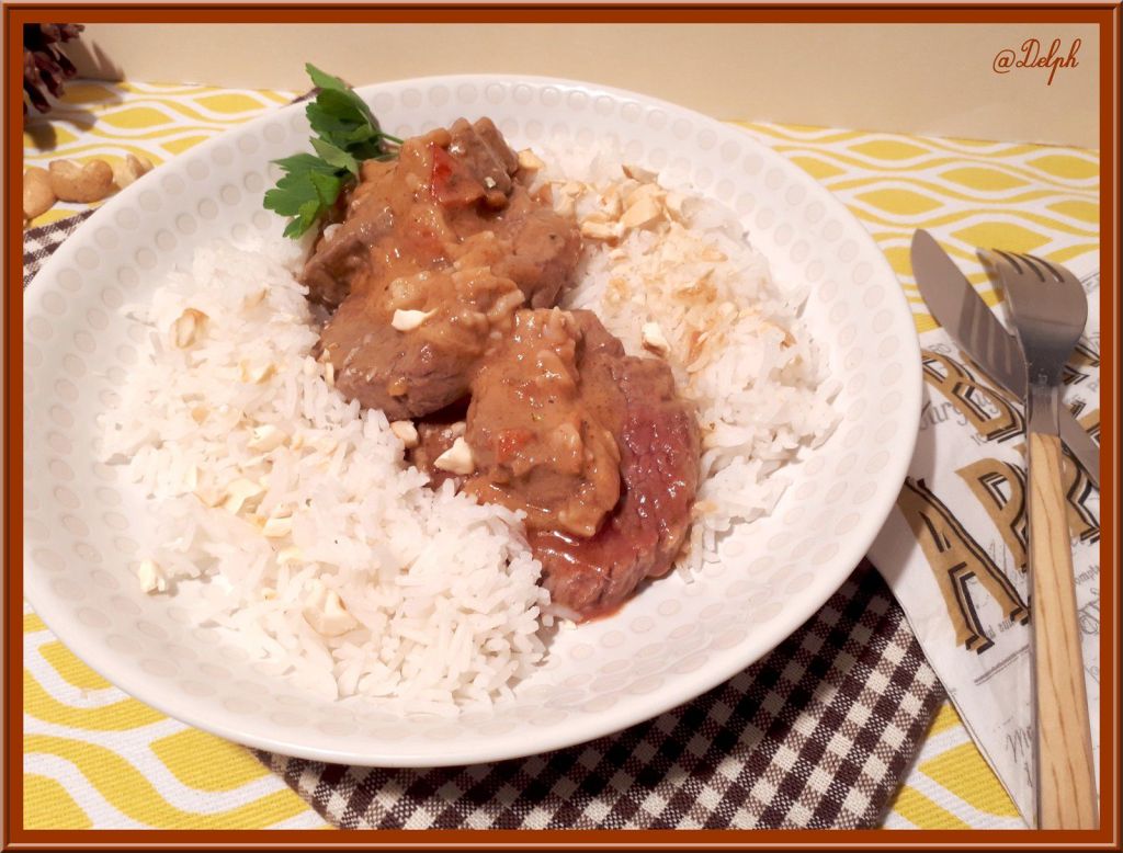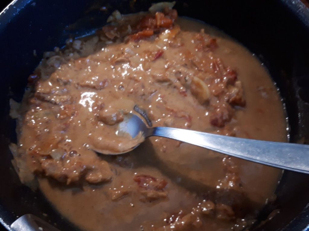 - Ajouter le bouillon, les tomates coupées en dés, le beurre d’arachide, assaisonner, mélanger, bien délayer le tout pendant quelques minutes, remettre la viande et continuer de faire chauffer sur feu moyen jusqu’à obtenir la cuisson désirée de votre viande, (pour nous pas trop cuite).