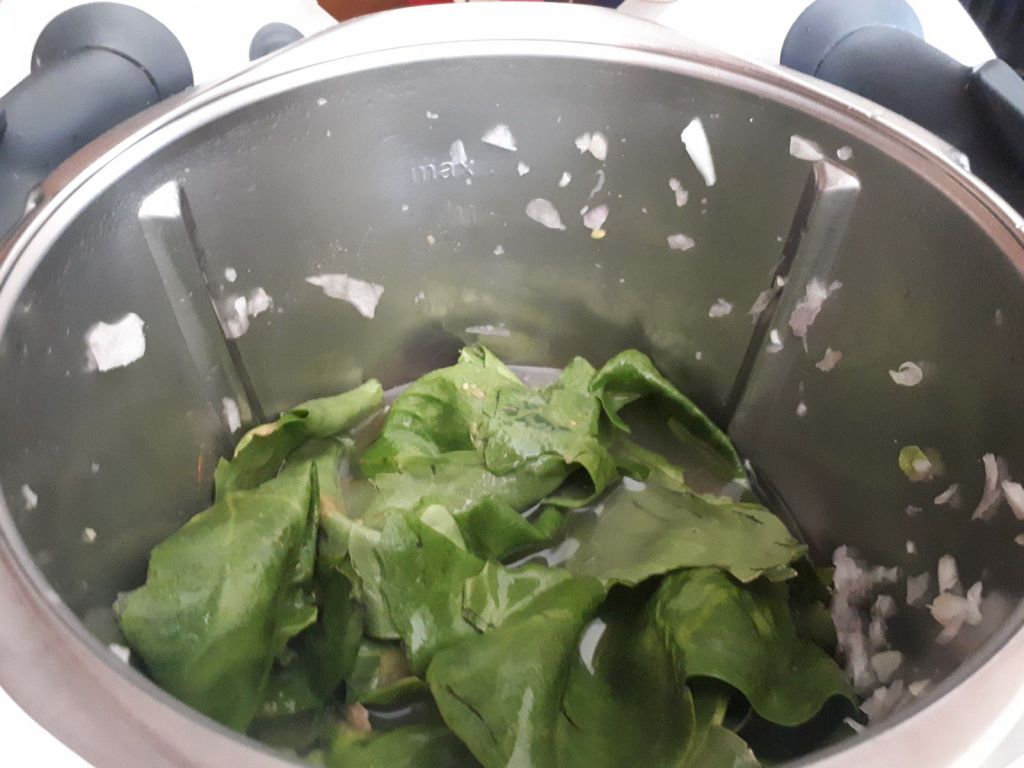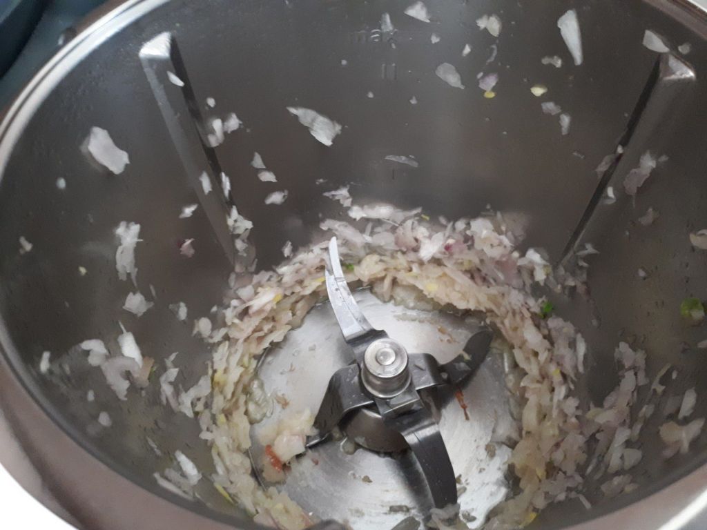 - Plucher vos échalotes, les couper en deux, les mettre dans le bol et les hacher 5sec/vit5, ajouter l’huile d’olive et faire revenir 3min/varoma/Vit1.