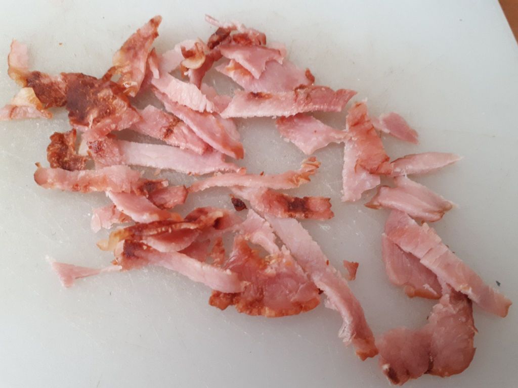 - Pendant la cuisson, faire chauffer vos tranches de bacon, dans une poêle antiadhésive, puis les mettre sur du papier absorbant pour enlever la graisse, les détailler en fines lanières.