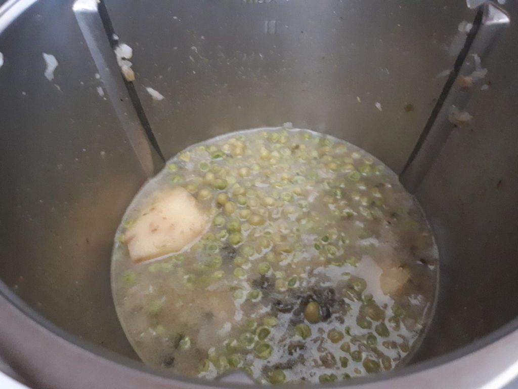 - Ajouter les petits pois, les pommes de terre lavées et coupées en gros dés, les feuilles d’oseille nettoyées avec la nervure centrale enlevée, couvrir avec le bouillon, assaisonner et faire chauffer 18 min/Varoma/Vit1, à la sonnerie mixer 20sec/de le vitesse 6 à 9.