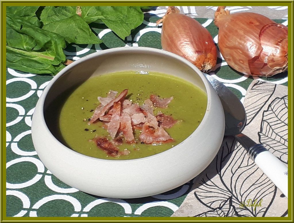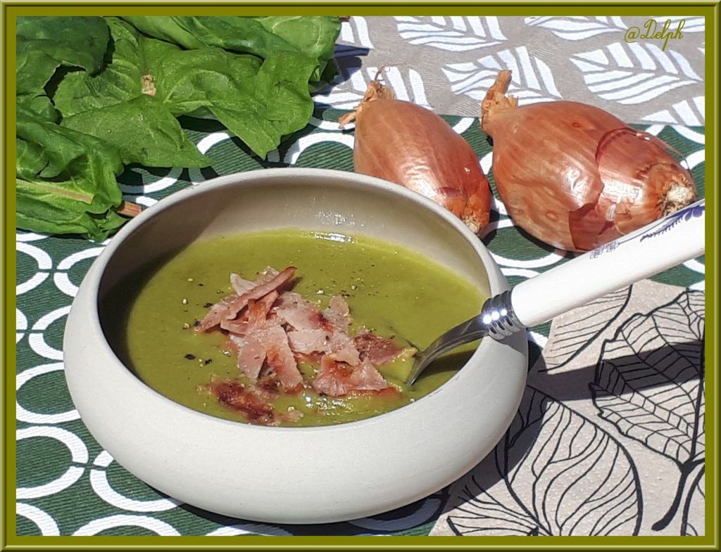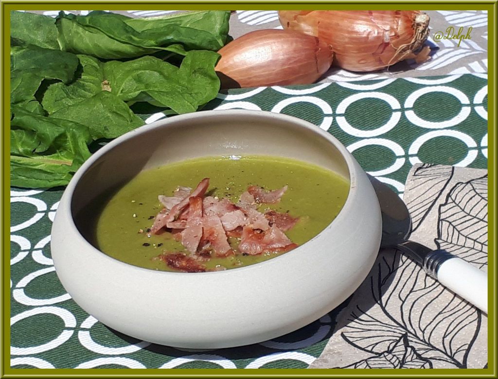 Ma belle-mère a plein d’oseille dans son jardin, et m’en a gentiment proposé, j’en ai donc profité pour me faire un petit velouté. Les soirées sont encore fraîches alors cela fait du bien. J’ai utilisé des petits pois surgelés, car bien sûr ce n’est pas du tout de saison, et je suis en train de vider mon congélateur.