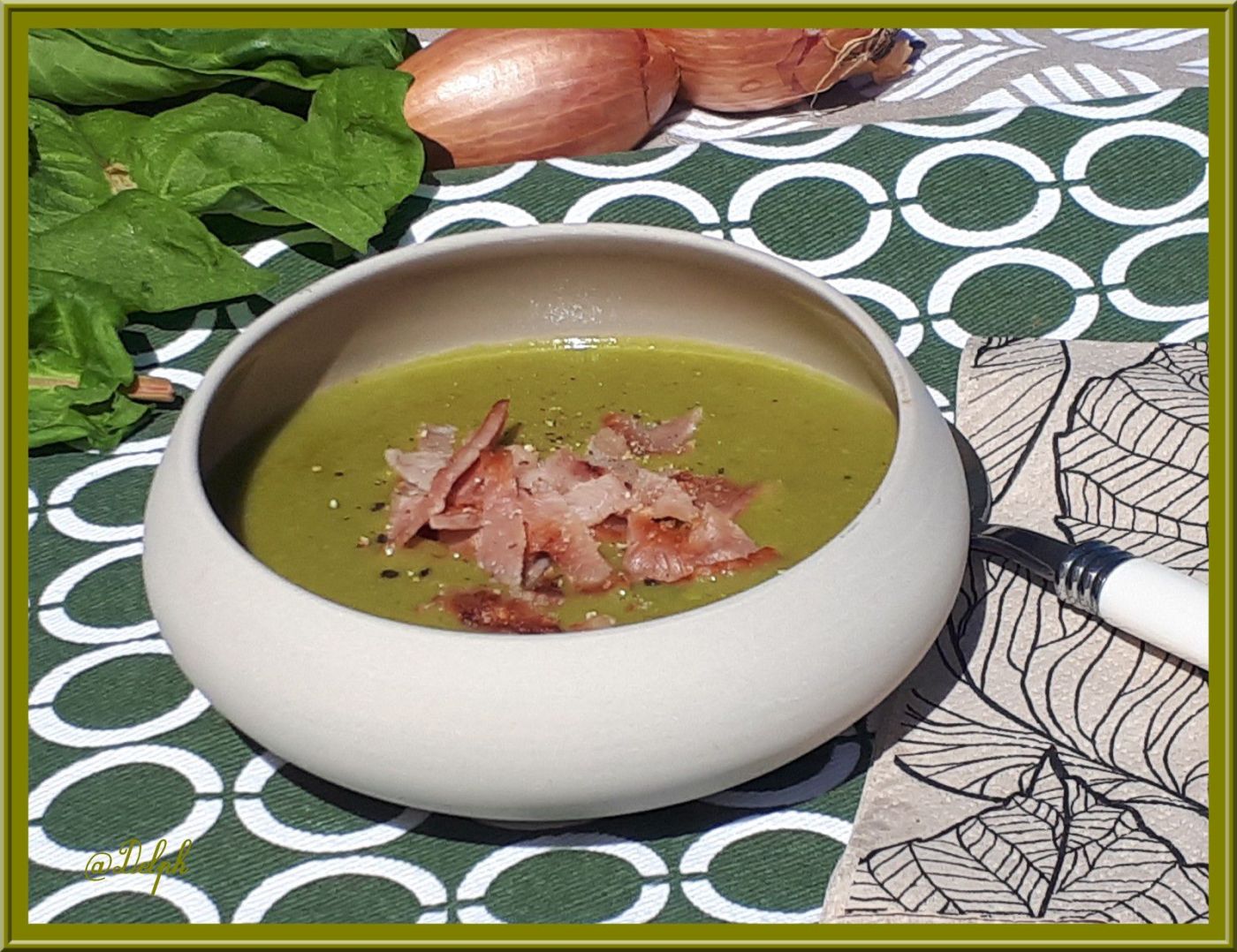 Ma belle-mère a plein d’oseille dans son jardin, et m’en a gentiment proposé, j’en ai donc profité pour me faire un petit velouté. Les soirées sont encore fraîches alors cela fait du bien. J’ai utilisé des petits pois surgelés, car bien sûr ce n’est pas du tout de saison, et je suis en train de vider mon congélateur.