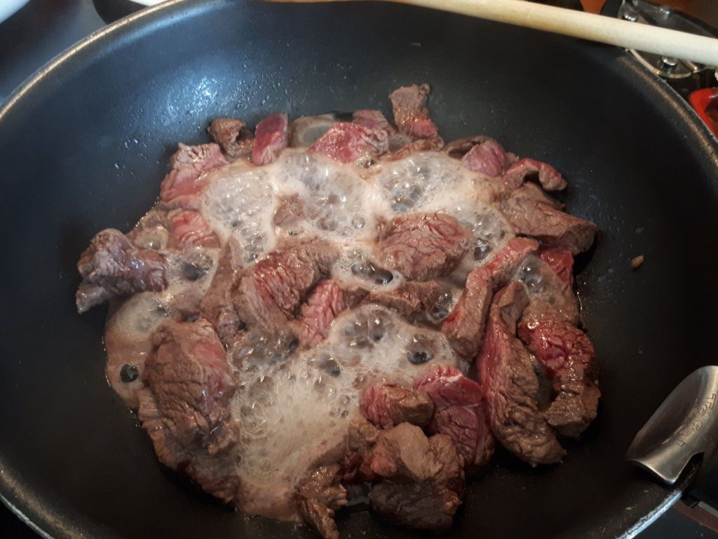 - Dans un wok faire cuire votre viande dans 1 cuillère à soupe d’huile chaude de chaque côté environ 5 minutes. Réserver. Garder le jus du bœuf pour le mélanger au bouillon de légumes.