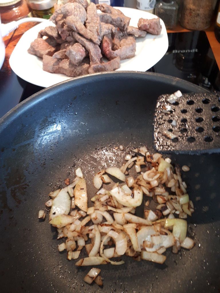 - Remettre dans le wok 1 c à s d’huile votre oignon haché, et faire revenir pendant 3 minutes en mélangeant ajouter le mélange d’épices, mélanger 1 minute.