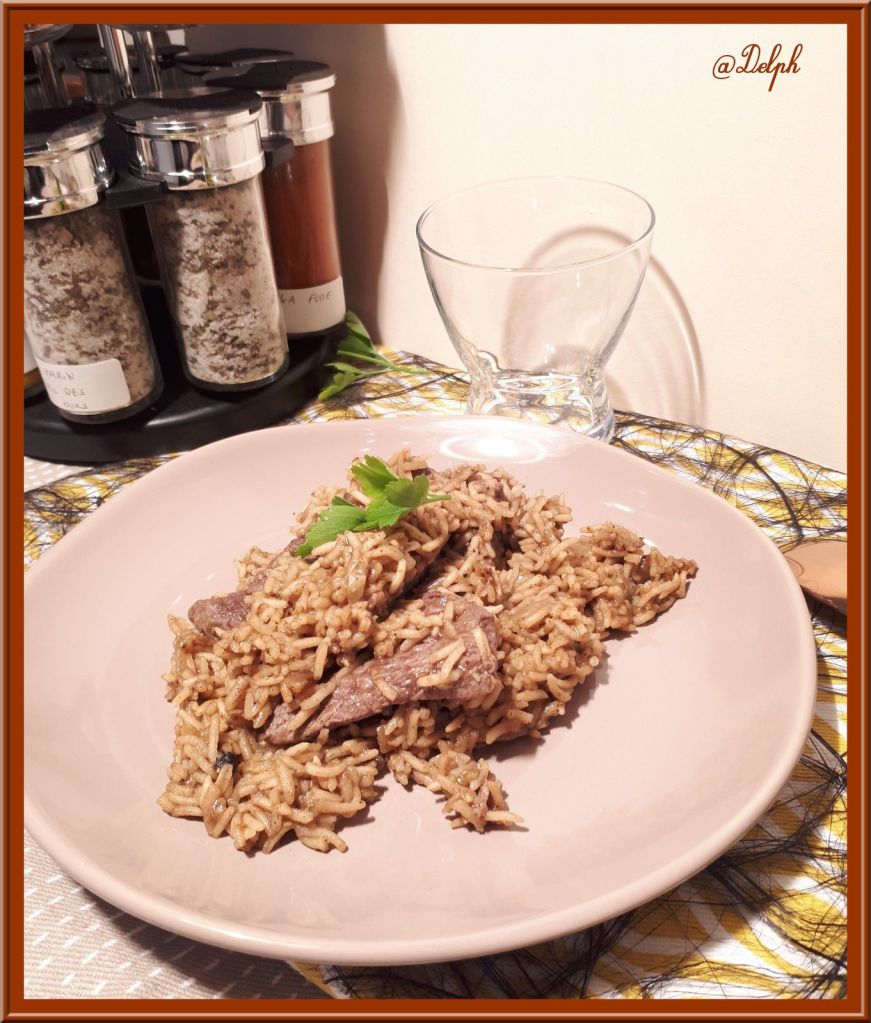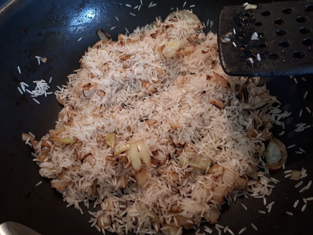 Je vous mets toutes les épices utilisées mais je pense que l’on peu enlever la cardamome et la cannelle, mais après c’est à vous de voir si vous souhaitez rester au plus près de la recette ou adapter selon vos goûts. J’ai déjà enlevé les clous de girofle, parce que j’ ai horreur de ce goût, et réduit les quantités d’épices. C’est la cuisson du riz qui est importante puisque ce féculent est imprégné de matière grasse puis on le recouvre d’eau pour le faire gonfler.