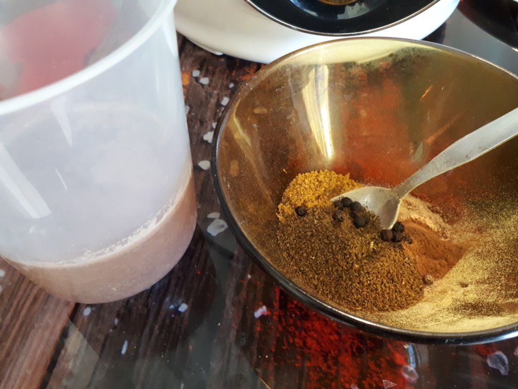 - Dans un récipient, mélanger les épices mettre, la cannelle, l’équivalent d’1 cm de gingembre que vous aurez au préalable râpé, le cumin, la cardamome, les grains de poivre, le curry. Mélanger le tout.