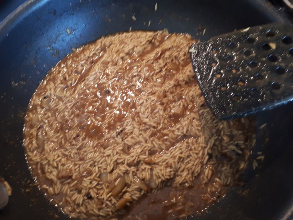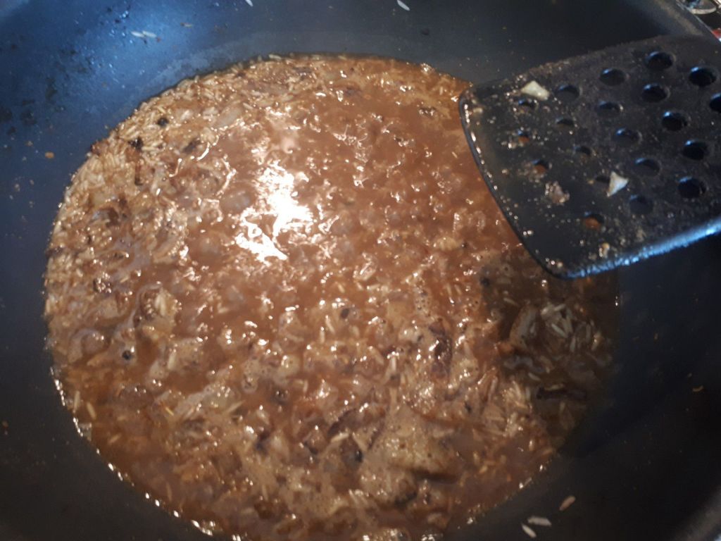 - Ajouter le riz avec le reste d’huile, mélanger, une fois le riz translucide mettre 20 cl de bouillon, puis mélanger, lorsque je jus s’est évaporé ( 5 minutes après environ) ajouter une nouvelle fois 20 cl, puis renouveler l’opération 1 fois, laisser à couvert à chaque fois, sur feu moyen cela prendra environ 15 minutes.