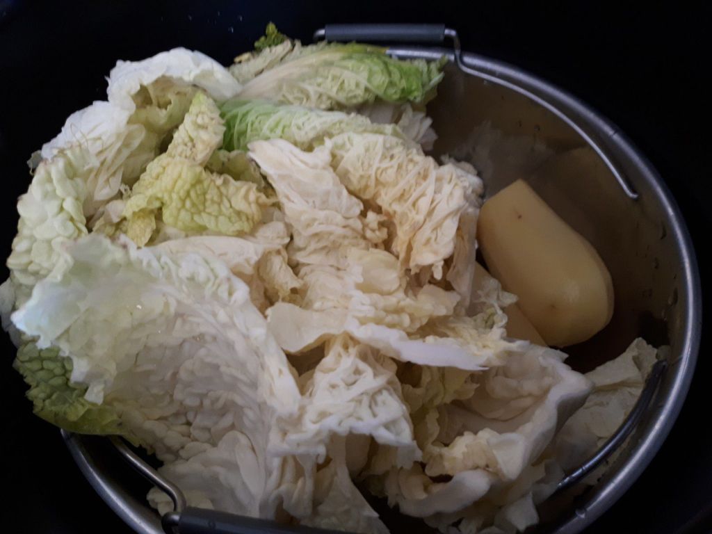 - Éplucher les pommes de terre, les laver, laver le chou, l’émincer. Déposer les légumes dans le panier cuisson.