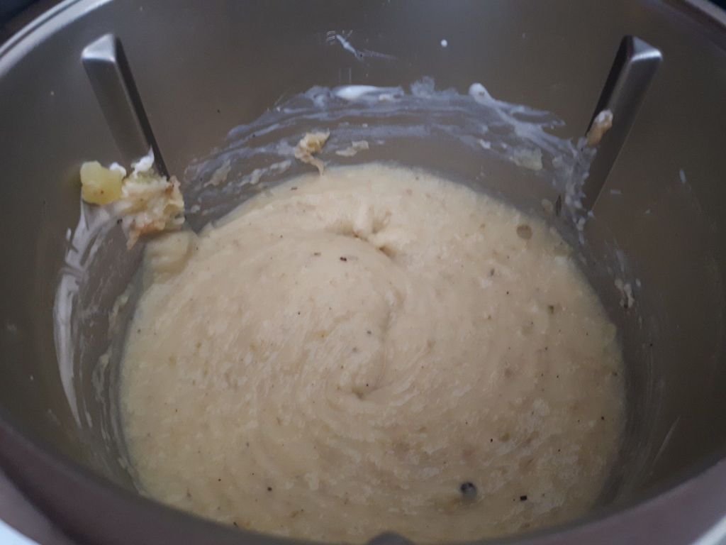 - A la fin de cuisson, mettre le contenu du panier dans un grand saladier. Ajouter le beurre, la crème, le sel, le poivre, la noix de muscade et mixer (au mixeur plongeant) jusqu’à obtenir la consistance souhaitée.