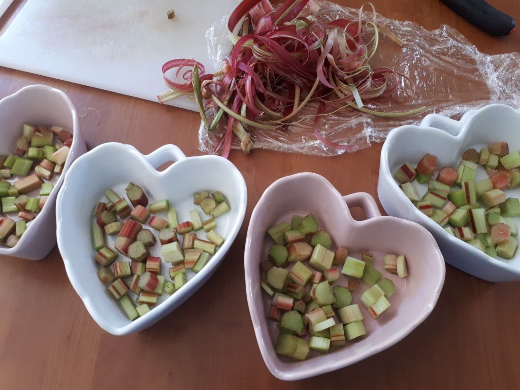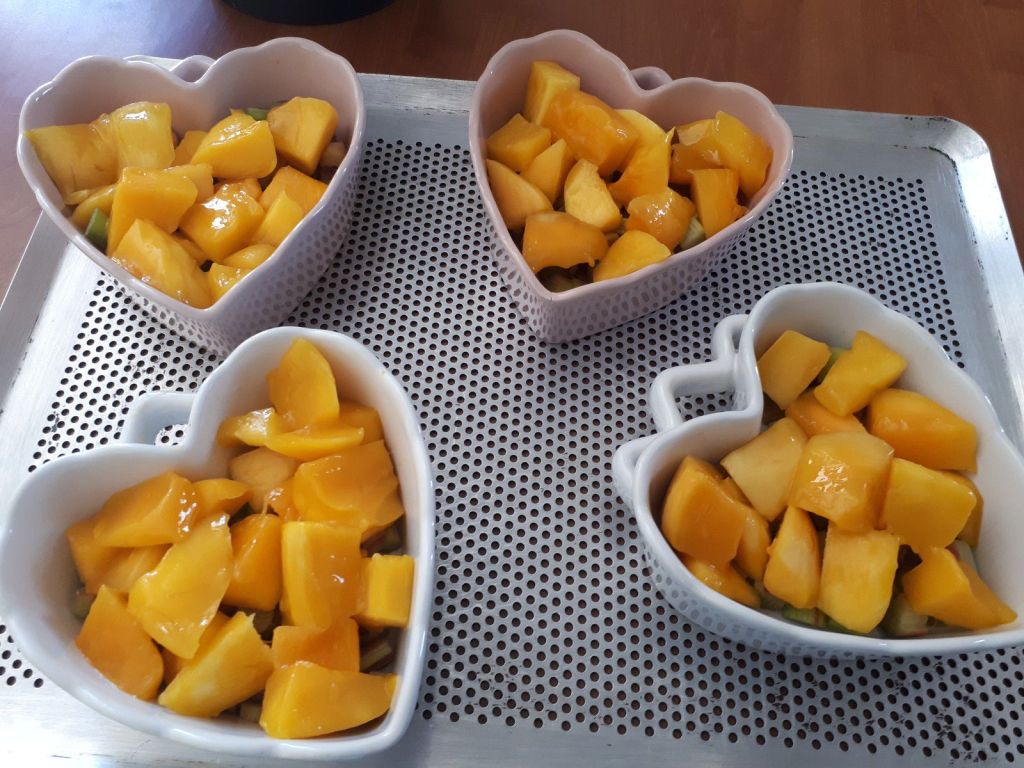 - Éplucher vos tiges de rhubarbe, les couper en petits tronçons, éplucher et couper votre mangue en cubes, les disposer au fond de vos moules.